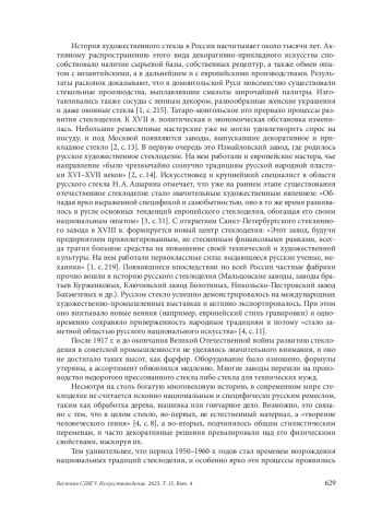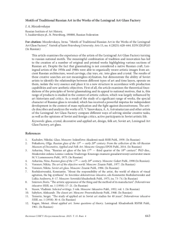 Исследуется опыт обращения художников Ленинградского завода художественного стекла к русским национальным мотивам. Осмысленное соединение традиций и новаторства привело к созданию ряда авторских и тиражных произведений, подсвечивающих различные срезы русского искусства. Несмотря на то что стеклоделие не считается исконно русским ремеслом, ленинградские художники 1950–1980-х годов смогли органично вплести в стекло и хрусталь художественные образы из древнерусской архитектуры, резьбы по дереву, глиняной игрушки и т. д. Результаты этих творческих поисков не являются бессодержательной стилизацией, но демонстрируют способность советских художников выявлять взаимосвязи между различными видами искусства и временными слоями, оперировать ими, вычленять самую суть и помещать ее в новую структуру в соответствии с производственными возможностями и новыми эстетическими задачами. Прежде всего рассматриваются теоретические обоснования принципов советского стеклоделия и его обращения к национальным мотивам, т. е. данный круг изделий исследуется в контексте художественной культуры, на которую в значительной мере влияли искусствоведы и критики. Обнаруживается особый характер русского стекла, получившего мощный импульс к самостоятельному развитию в условиях массового тиражирования и борьбы с декоративностью. Описываются и анализируются работы Е. В. Яновской, А. А. Аствацатурьяна и других художников Ленинградского завода художественного стекла, сравниваются разные способы решения сходных творческих задач, а также приводятся мнения советских и зарубежных критиков, активных участников советской художественной жизни