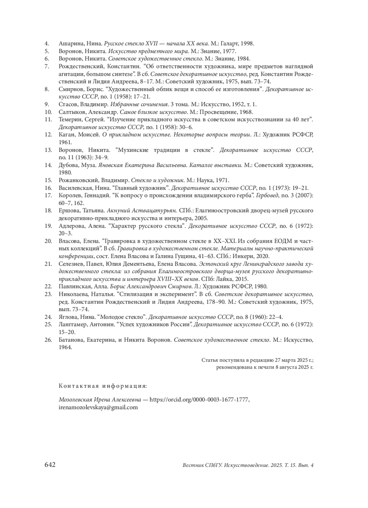 19. Адлерова, Алена. “Характер русского стекла”. Декоративное искусство СССР, no. 6 (1972): 20-3.
