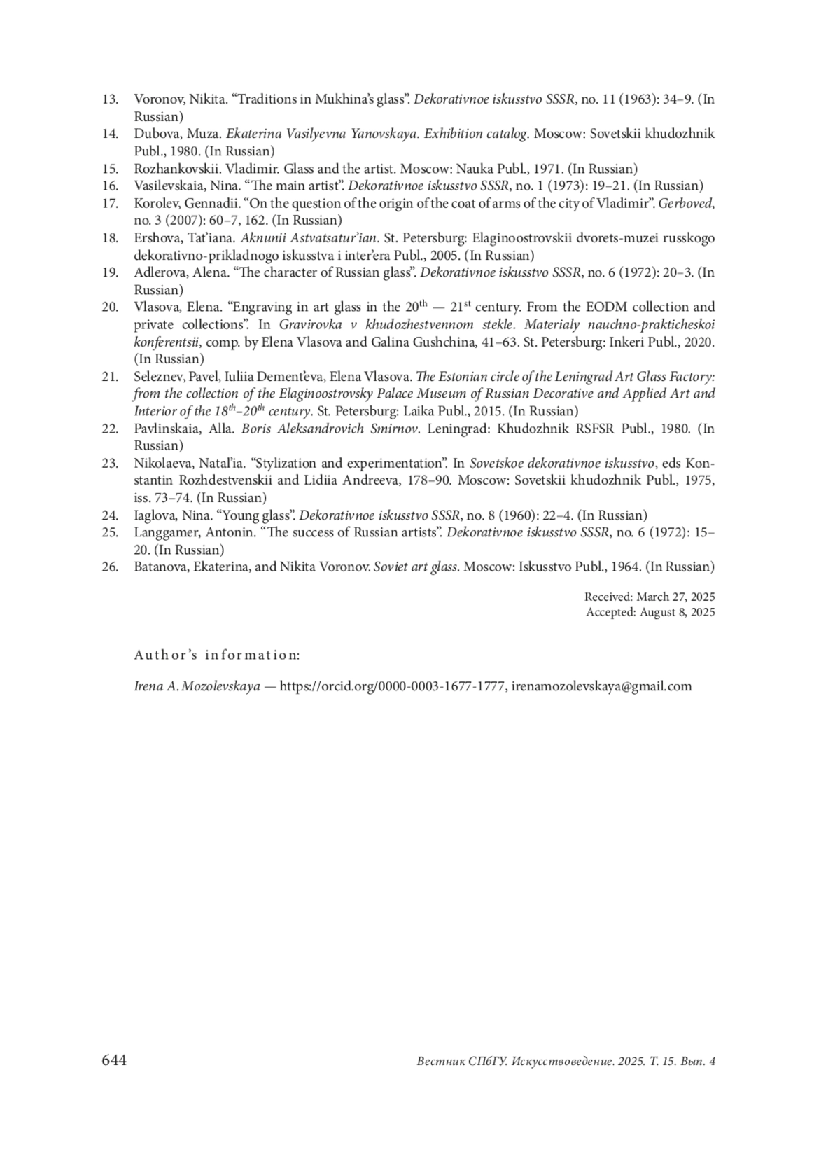 13. Воронов, Никита. “Мухинские традиции в стекле”. Декоративное искусство СССР, no. 11 (1963): 34-9.