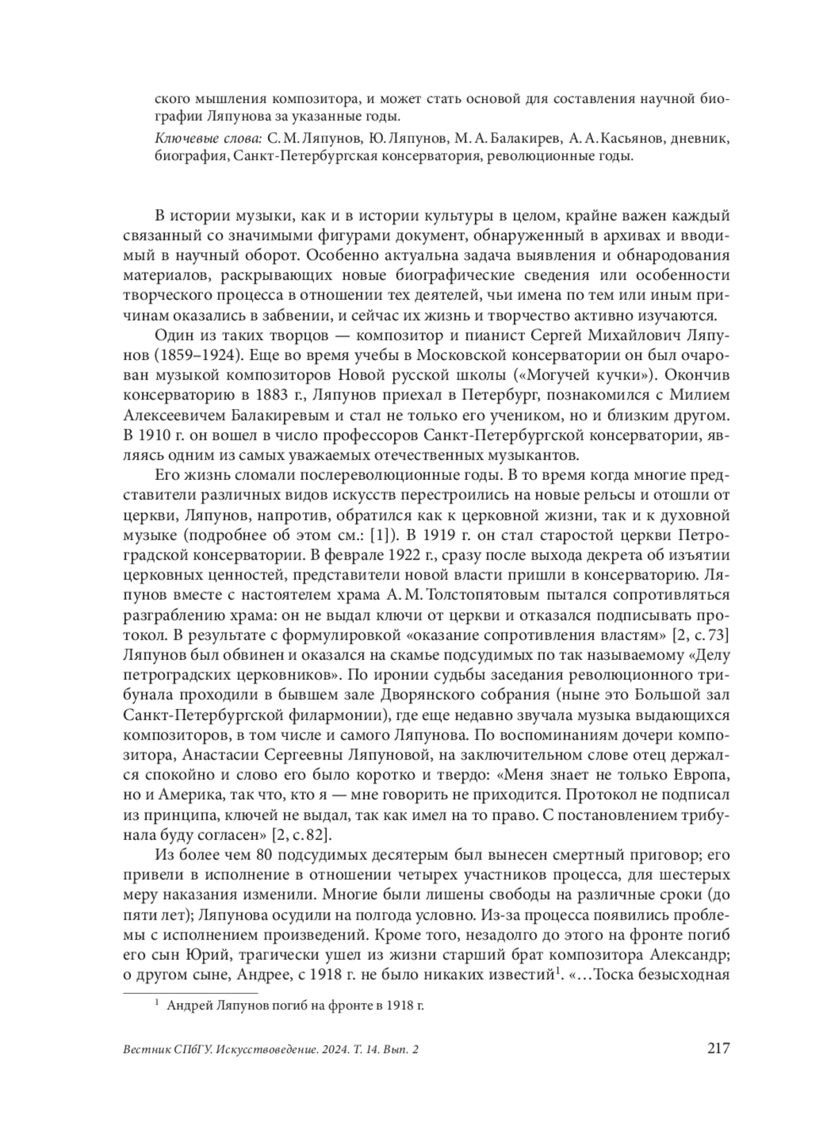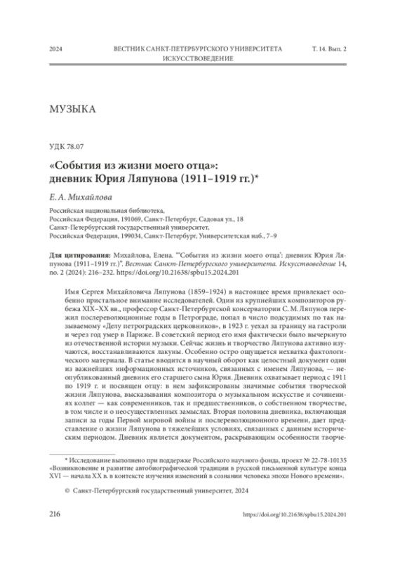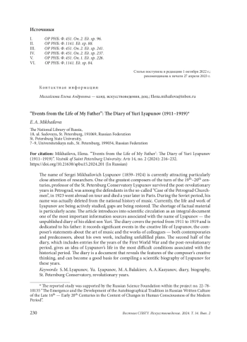 Имя Сергея Михайловича Ляпунова (1859–1924) в настоящее время привлекает особенно пристальное внимание исследователей. Один из крупнейших композиторов рубежа XIX–XX вв., профессор Санкт-Петербургской консерватории С. М. Ляпунов пережил послереволюционные годы в Петрограде, попал в число подсудимых по так называемому «Делу петроградских церковников», в 1923 г. уехал за границу на гастроли и через год умер в Париже. В советский период его имя фактически было вычеркнуто из отечественной истории музыки. Сейчас жизнь и творчество Ляпунова активно изучаются, восстанавливаются лакуны. Особенно остро ощущается нехватка фактологического материала. В статье вводится в научный оборот как целостный документ один из важнейших информационных источников, связанных с именем Ляпунова, — неопубликованный дневник его старшего сына Юрия. Дневник охватывает период с 1911 по 1919 г. и посвящен отцу: в нем зафиксированы значимые события творческой жизни Ляпунова, высказывания композитора о музыкальном искусстве и сочинениях коллег — как современников, так и предшественников, о собственном творчестве, в том числе и о неосуществленных замыслах. Вторая половина дневника, включающая записи за годы Первой мировой войны и послереволюционного времени, дает представление о жизни Ляпунова в тяжелейших условиях, связанных с данным историческим периодом. Дневник является документом, раскрывающим особенности творческого мышления композитора, и может стать основой для составления научной биографии Ляпунова за указанные годы