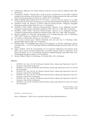 32. Барсова, Людмила, публ., подгот. текста и примеч. “Из переписки Н. А. Римского-Корсакова с В. В. Ястребцевым (1905-1907)”. Звезда, no. 3 (2004): 142-63.