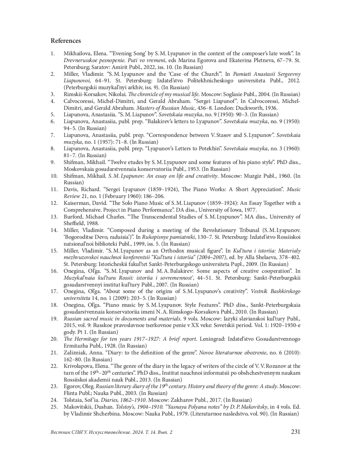 1. Михайлова, Елена. “‘Вечерняя песнь’ С. М. Ляпунова в контексте позднего творчества композитора”. В сб. Древнерусское песнопение. Пути во времени, под ред. Марины Егоровой и Екатерины Плетневой, 67-79. СПб.; Саратов: Амирит, 2022, вып. 10.