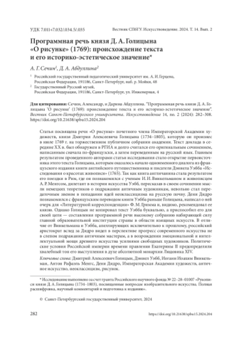 Статья посвящена речи «О рисунке» почетного члена Императорской Академии художеств, князя Дмитрия Алексеевича Голицына (1734–1803), которую он произнес в июле 1769 г. на торжественном публичном собрании академии. Текст доклада в середине XX в. был обнаружен в РГИА и долго считался его оригинальным сочинением, написанным сначала по-французски, а затем переведенным на русский язык. Главным результатом проведенного авторами статьи исследования стало открытие первоисточника этого текста Голицына, которым оказалось начало одноименного диалога из французского издания книги английского путешественника и писателя Дэниела Уэбба «Исследования о красотах живописи» (1765). Так как книга англичанина стала результатом его поездки в Рим, где он познакомился с ученым И. И. Винкельманом и живописцем А. Р. Менгсом, дилетант в истории искусства Уэбб, пересказав в своем сочинении мысли немецких теоретиков о подражании античным художникам, невольно стал передаточным звеном в попадании идей неоклассицизма на русскую почву. Дени Дидро познакомился с французским переводом книги Уэбба раньше Голицына, написал о ней очерк для «Литературной корреспонденции» Ф. М. Гримма и, видимо, рекомендовал ее князю. Однако Голицын не копировал текст Уэбба буквально, а приспособил его для своей цели — составления программной речи высокому собранию набирающей силу главной образовательной институции страны в области изящных искусств. В отличие от Винкельмана и Уэбба, апеллирующих исключительно к прошлому, российский аристократ вслед за Дидро видел в перспективе прогресс современного искусства не в слепом подражании античным мастерам, а в возрождении эмоциональной и интеллектуальной мощи древнего искусства усилиями свободных художников. Политические условия Российской империи времени правления Екатерины II предопределили хвалебный тон его выступления в духе абсолютной монархии Людовика XIV
