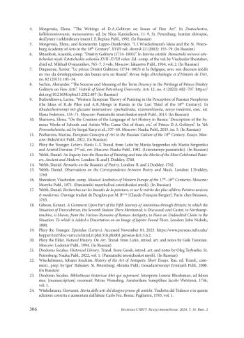 10. Шарнова, Елена. “О создании языка истории искусства в России: ‘Описание знаменитых произведениями школ и вышедших из оных художников и проч.’ князя Д. А. Голицына”. В изд. Век Просвещения, ред. Сергей Карп и др., 337-60. М.: Наука, 2015, вып. 5.