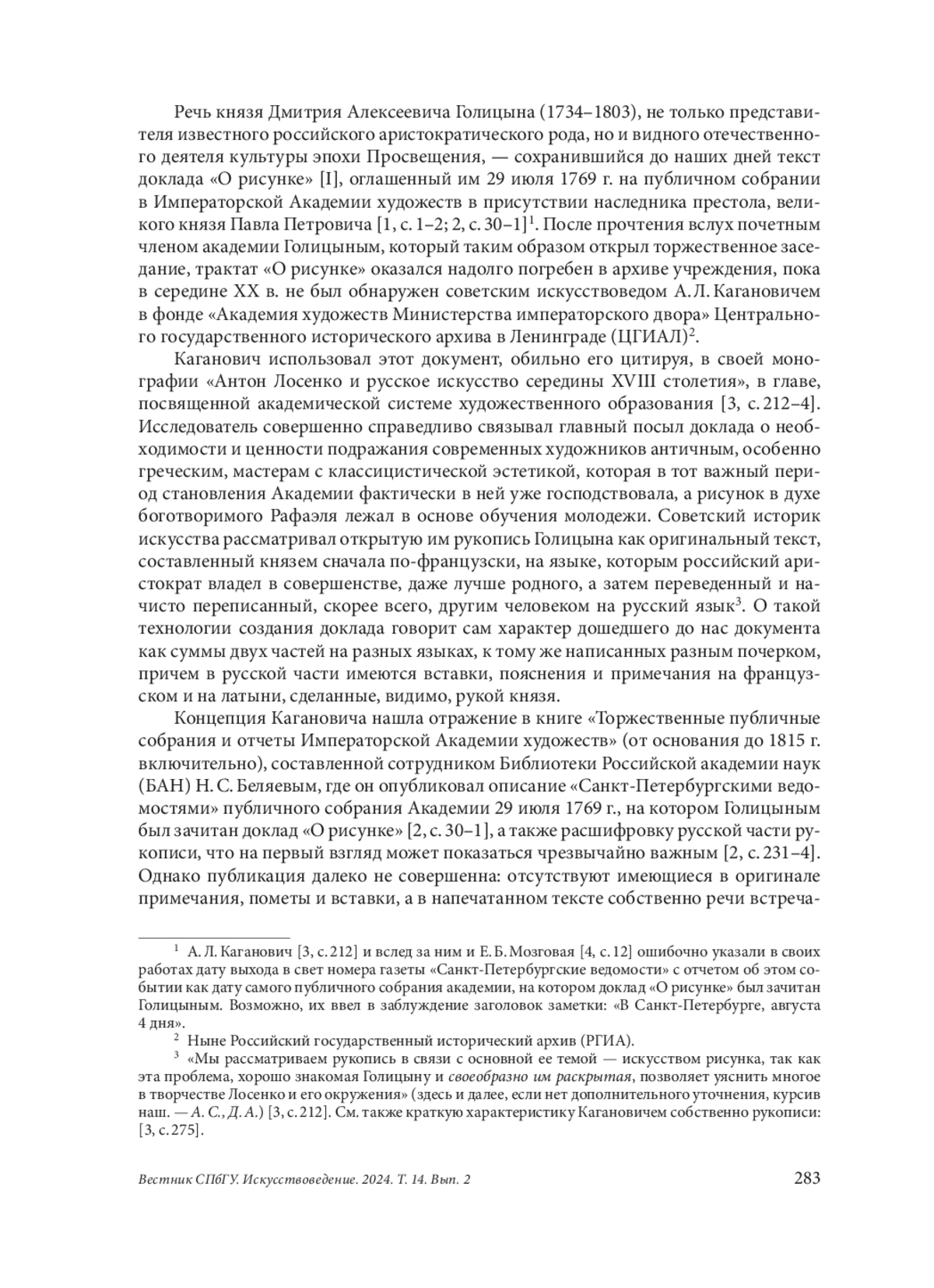 Речь князя Дмитрия Алексеевича Голицына (1734–1803), не только представителя известного российского аристократического рода, но и видного отечественного деятеля культуры эпохи Просвещения, — сохранившийся до наших дней текст доклада «О рисунке» [I], оглашенный им 29 июля 1769 г. на публичном собрании в Императорской Академии художеств в присутствии наследника престола, великого князя Павла Петровича [1, с. 1–2; 2, с. 30–1]1. После прочтения вслух почетным членом академии Голицыным, который таким образом открыл торжественное заседание, трактат «О рисунке» оказался надолго погребен в архиве учреждения, пока в середине XX в. не был обнаружен советским искусствоведом А. Л. Кагановичем в фонде «Академия художеств Министерства императорского двора» Центрального государственного исторического архива в Ленинграде (ЦГИАЛ)2