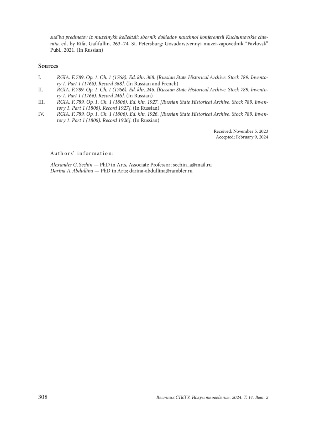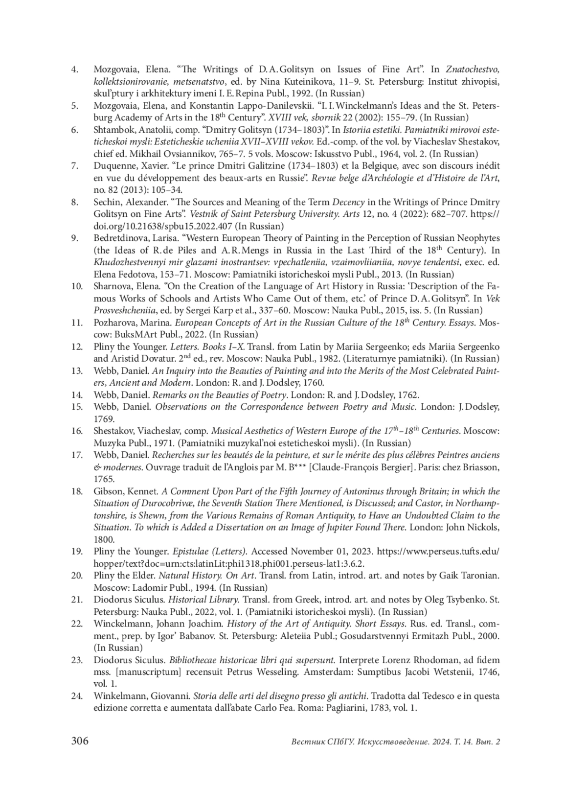 8. Сечин, Александр. “Истоки и смысл термина ‘пристойность’ в сочинениях князя Д. А. Голицына об изобразительных искусствах”. Вестник Санкт-Петербургского университета. Искусствоведение 12, no. 4 (2022): 682-707. DOI: 10.21638/spbu15.2022.407 EDN: ZNZQOO
