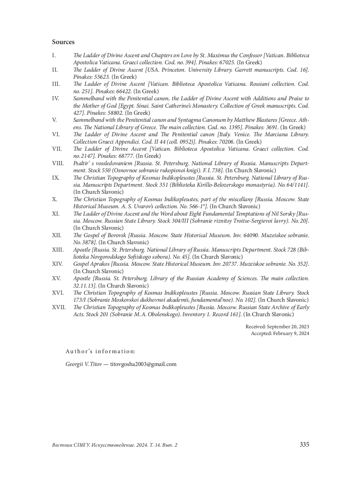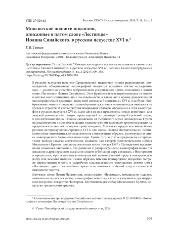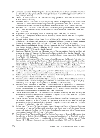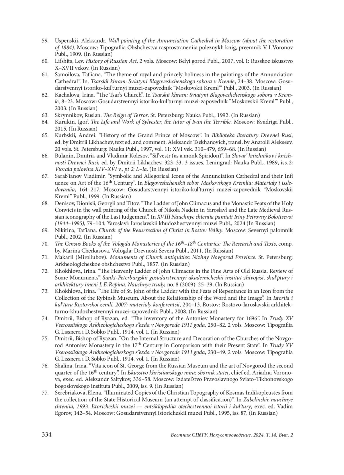 68. Денисов, Дионисий, и Георгий Титов. “Лествица Иоанна Синаита с подвигами святых осужденников в росписи церкви Николы Надеина и позднесредневековая русская иконография Страшного суда”. В изд. XVIII Научные чтения памяти Ирины Петровны Болотцевой (1944-1995), 79-104. Ярославль: Яросл. художеств. музей, 2024.