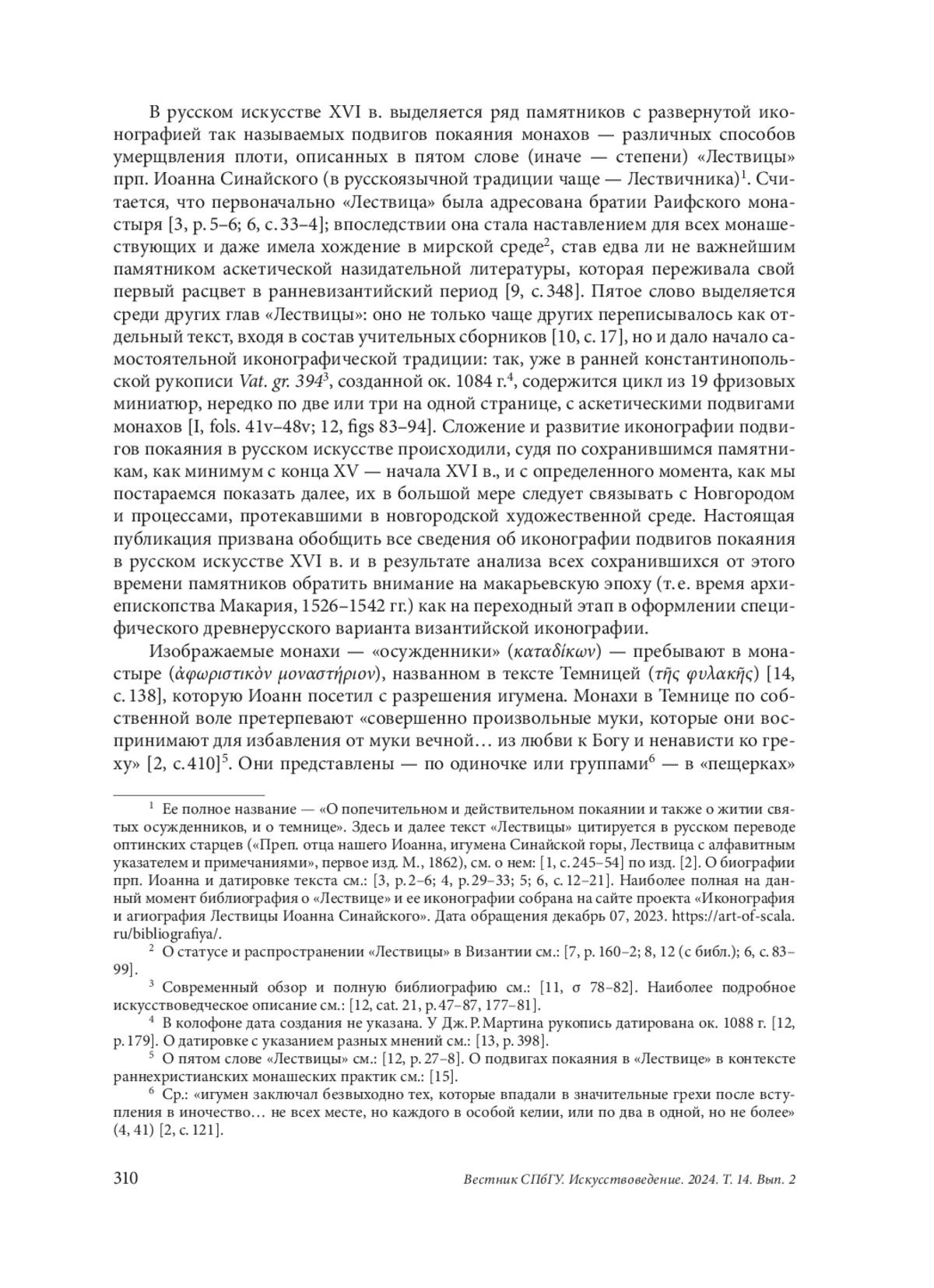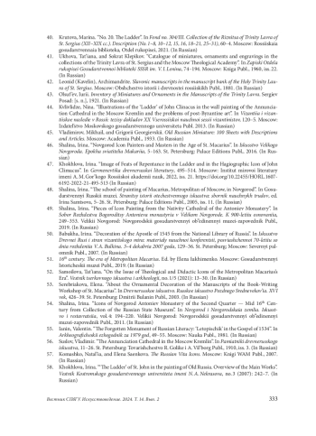 72. Хохлова, Ирина. “‘Лествица’ преподобного Иоанна в изобразительном искусстве Древней Руси. Обзор некоторых памятников”. Санкт-Петербургский государственный академический институт живописи, скульптуры и архитектуры им. И. Е. Репина. Научные труды, no. 8 (2009): 25-39.