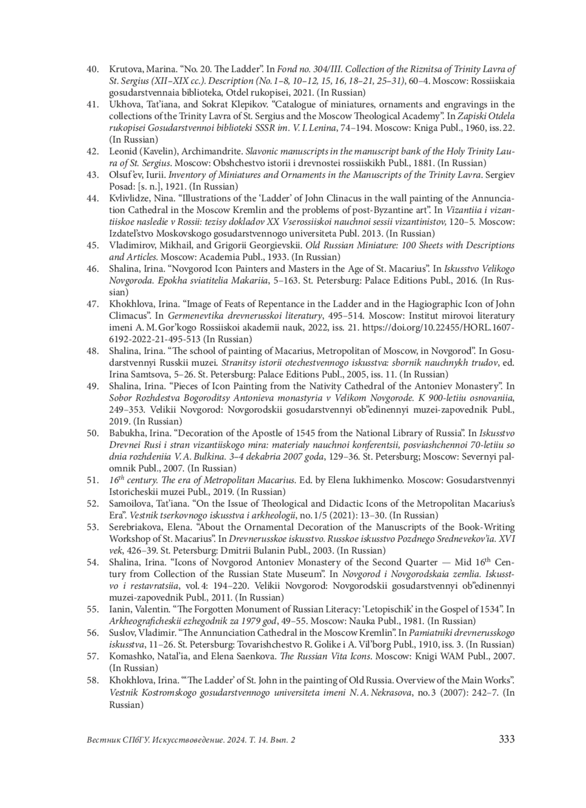 58. Хохлова, Ирина. “‘Лествица’ преподобного Иоанна в живописи Древней Руси. Обзор основных произведений”. Вестник КГУ им. Н. А. Некрасова, no. 3 (2007): 242-7. EDN: MTBZOX