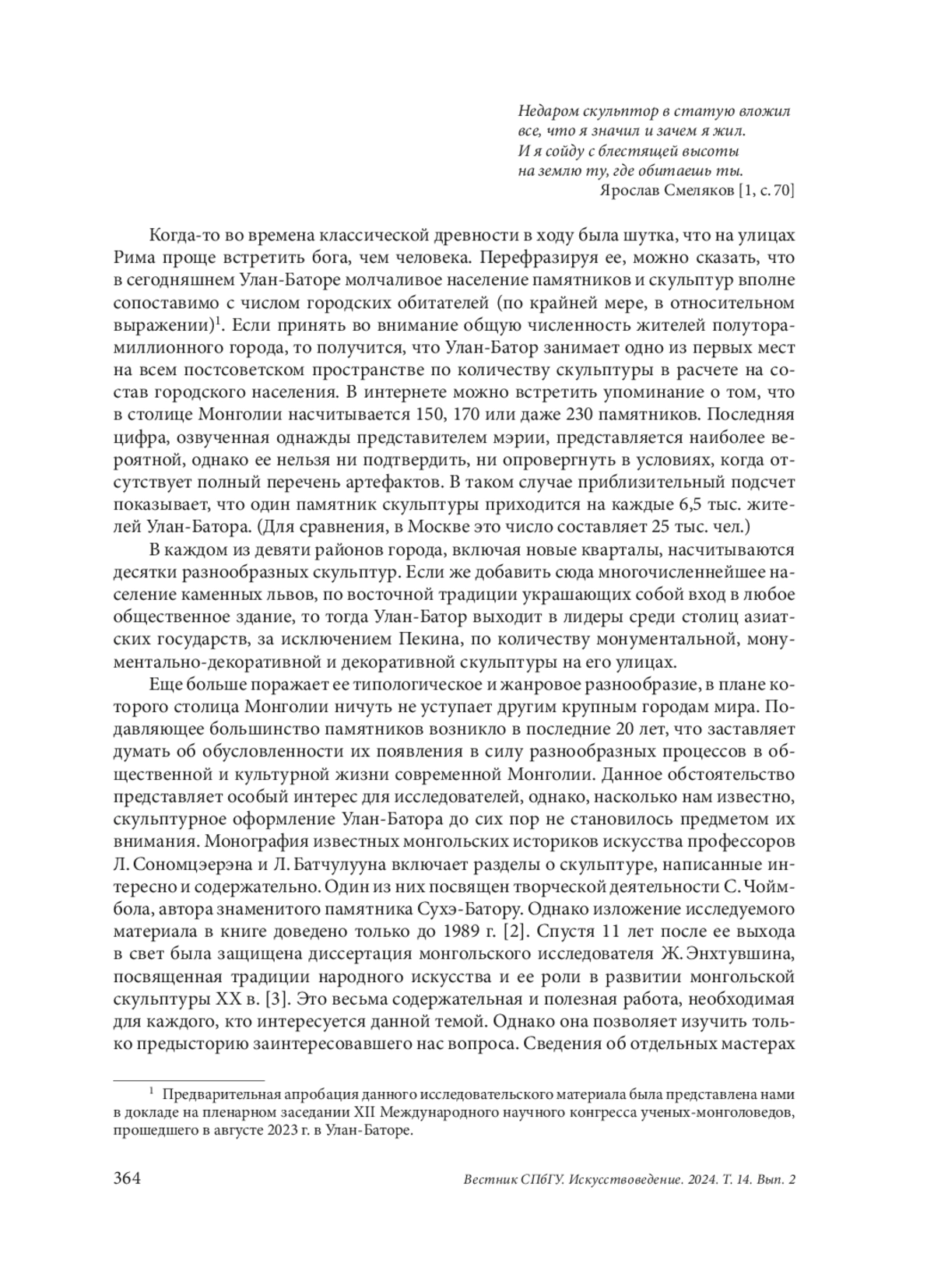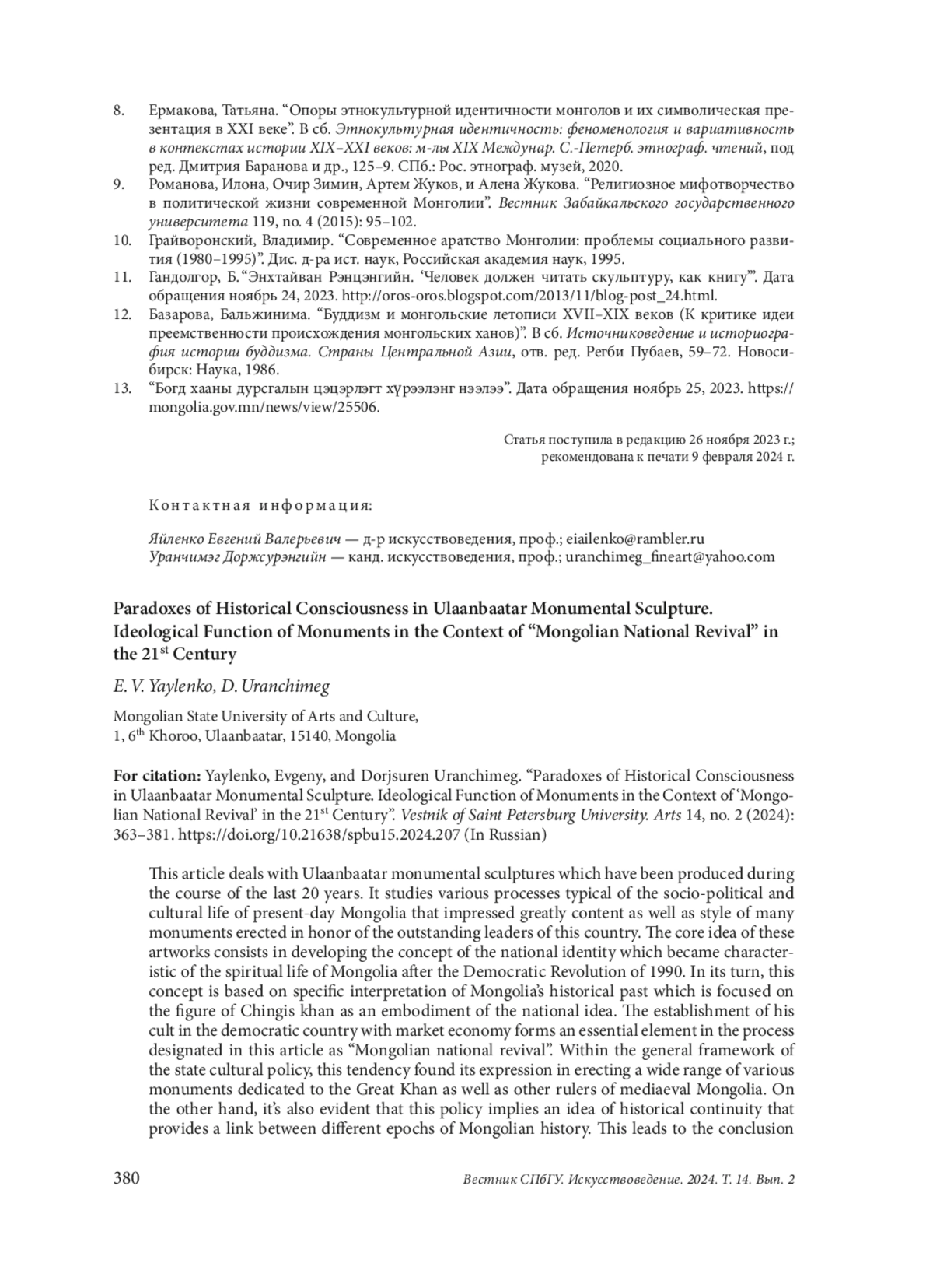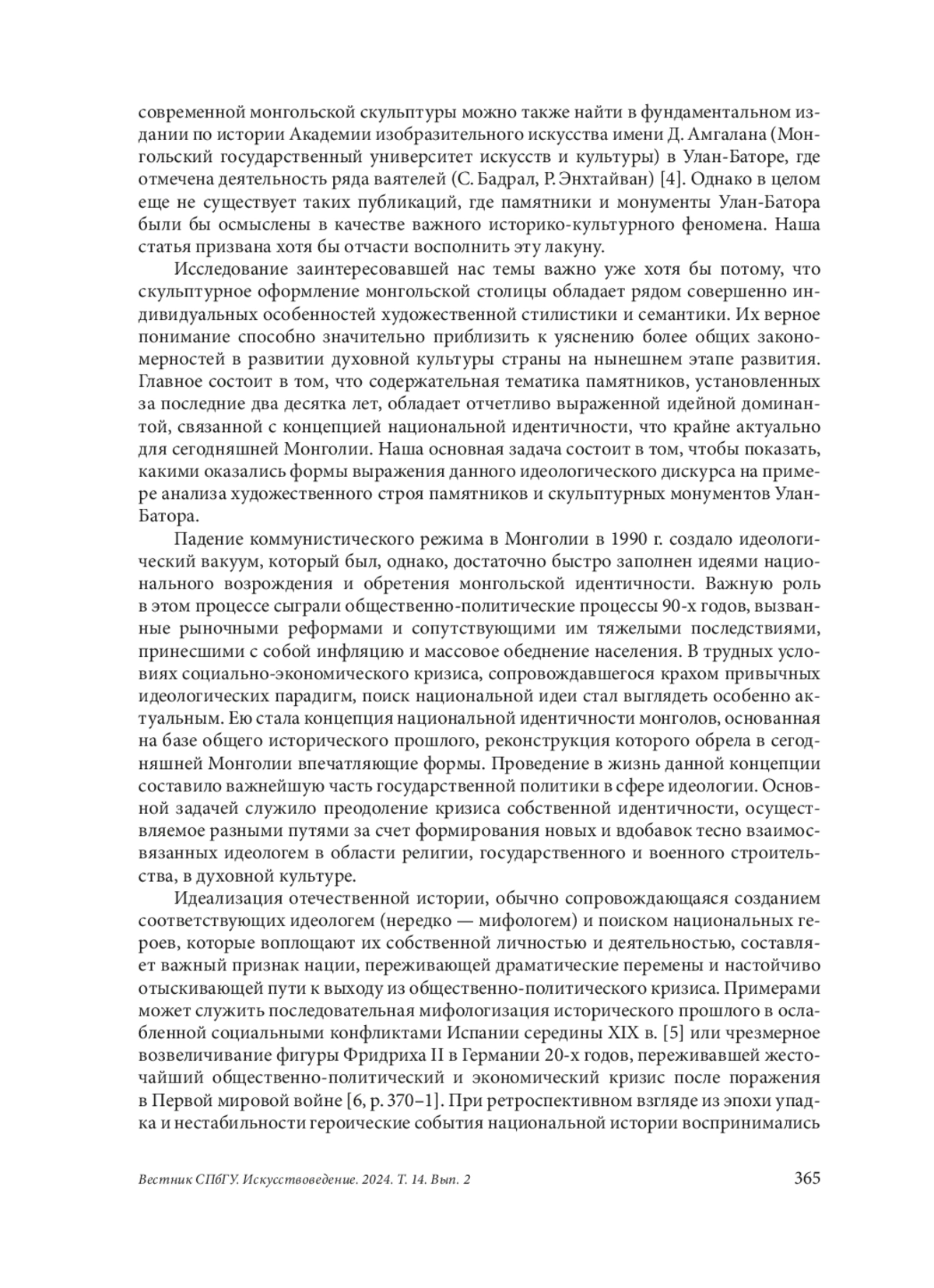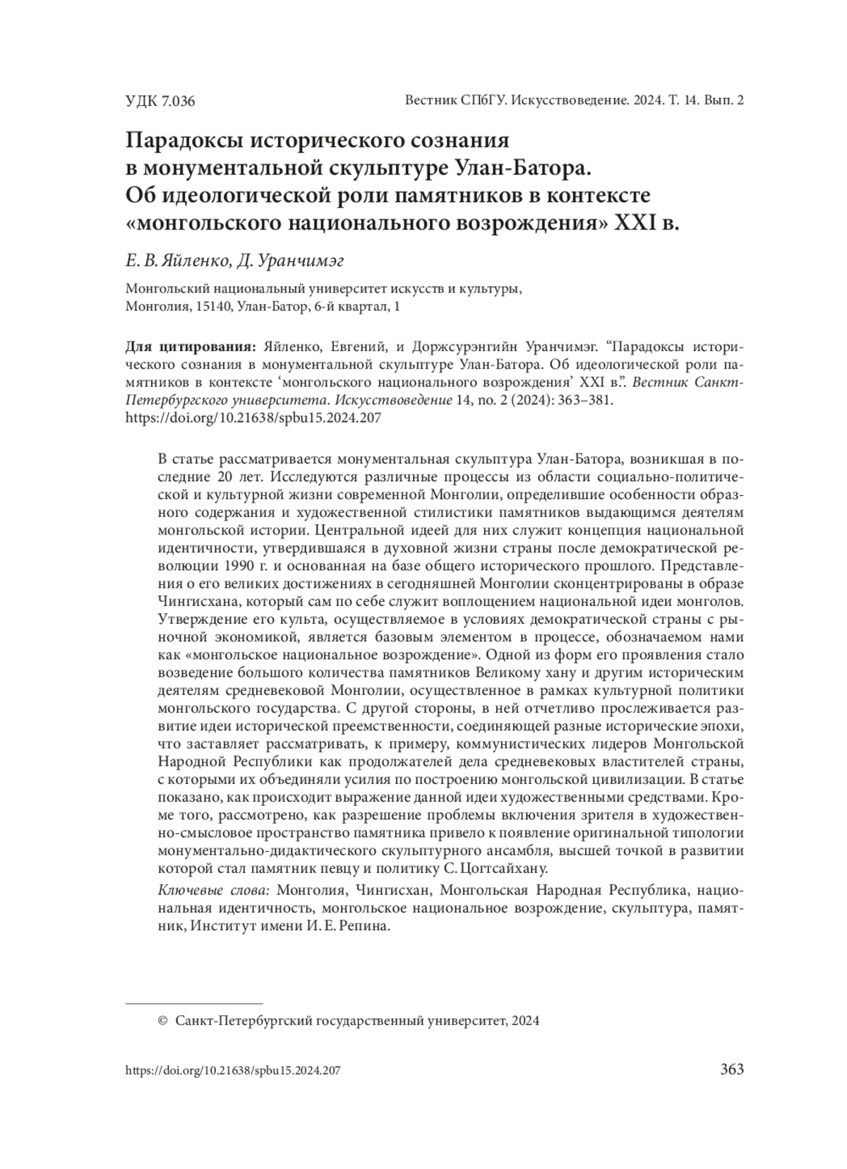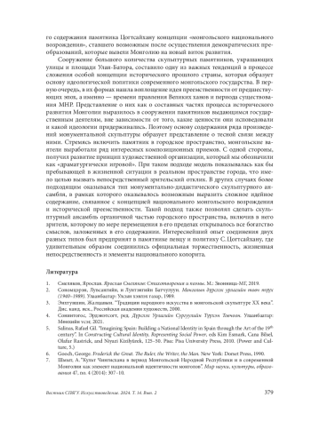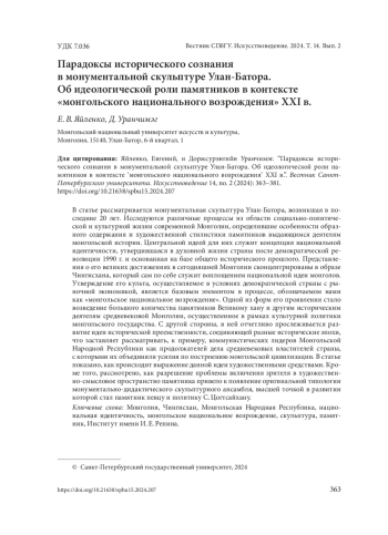 В статье рассматривается монументальная скульптура Улан-Батора, возникшая в последние 20 лет. Исследуются различные процессы из области социально-политической и культурной жизни современной Монголии, определившие особенности образного содержания и художественной стилистики памятников выдающимся деятелям монгольской истории. Центральной идеей для них служит концепция национальной идентичности, утвердившаяся в духовной жизни страны после демократической революции 1990 г. и основанная на базе общего исторического прошлого. Представления о его великих достижениях в сегодняшней Монголии сконцентрированы в образе Чингисхана, который сам по себе служит воплощением национальной идеи монголов. Утверждение его культа, осуществляемое в условиях демократической страны с рыночной экономикой, является базовым элементом в процессе, обозначаемом нами как «монгольское национальное возрождение». Одной из форм его проявления стало возведение большого количества памятников Великому хану и другим историческим деятелям средневековой Монголии, осуществленное в рамках культурной политики монгольского государства. С другой стороны, в ней отчетливо прослеживается развитие идеи исторической преемственности, соединяющей разные исторические эпохи, что заставляет рассматривать, к примеру, коммунистических лидеров Монгольской Народной Республики как продолжателей дела средневековых властителей страны, с которыми их объединяли усилия по построению монгольской цивилизации. В статье показано, как происходит выражение данной идеи художественными средствами. Кроме того, рассмотрено, как разрешение проблемы включения зрителя в художественно-смысловое пространство памятника привело к появление оригинальной типологии монументально-дидактического скульптурного ансамбля, высшей точкой в развитии которой стал памятник певцу и политику С. Цогтсайхану