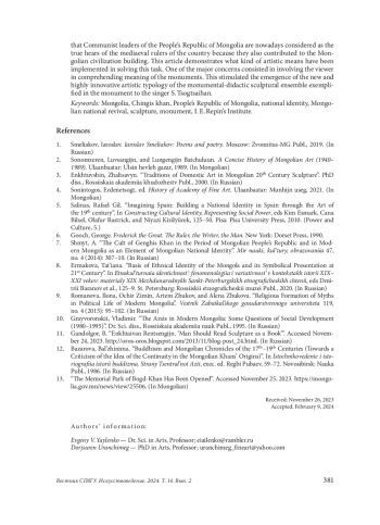 7. Шмыт, А. “Культ Чингисхана в период Монгольской Народной Республики и в современной Монголии как элемент национальной идентичности монголов”. Мир науки, культуры, образования 47, no. 4 (2014): 307-10.