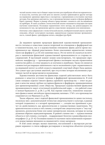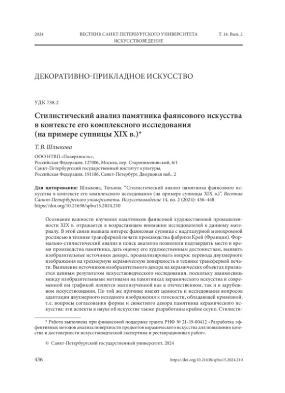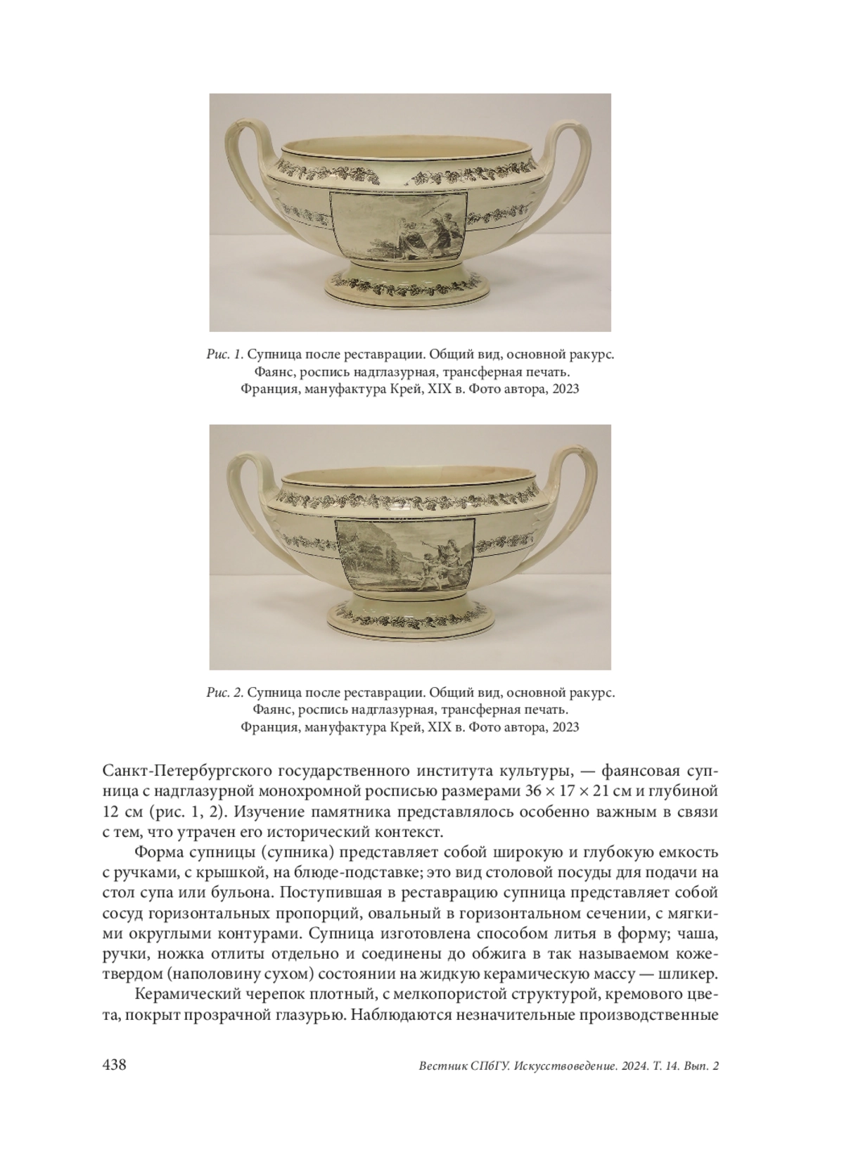 Осознание важности изучения памятников фаянсовой художественной промышленности XIX в. отражается в возрастающем внимании исследователей к данному материалу. В этой связи вызвала интерес фаянсовая супница с надглазурной монохромной росписью в технике трансферной печати производства фабрики Крей (Франция). Формально-стилистический анализ и поиск аналогов позволили подтвердить место и время производства памятника, дать оценку его художественным достоинствам, выявить изобразительные источники декора, проанализировать вопрос перевода двухмерного изображения на трехмерную керамическую поверхность в технике трансферной печати. Выявление источников изобразительного декора на керамических объектах признается ценным результатом искусствоведческого исследования, поскольку взаимосвязь между изобразительными мотивами на памятниках керамического искусства и современной им графикой является малоизученной как в отечественном, так и в зарубежном искусствознании. По той же причине имеют ценность и исследования вопросов адаптации двухмерного исходного изображения к плоскости, обладающей кривизной, т. е. вопросы согласования формы и сюжетного декора памятника керамического искусства: эти аспекты в науке об искусстве также разработаны крайне скупо. Стилистический анализ очень часто бывает недостаточен для атрибуции объектов керамического искусства, поэтому для этой цели во многих случаях привлекаются другие методы исследования: архивная эвристика и экспертиза с применением естественно-научных методов. Как архивные документы, так и производственные модели и формы фабрики Крей утрачены. Форма и размер объекта представляют сложность для исследования на приборах. В таких условиях стилистический анализ оказывается ведущим методом изучения памятников. Осознавая ограничения этого метода, мы демонстрируем его возможности там, где применение других существенно затруднено или невозможно