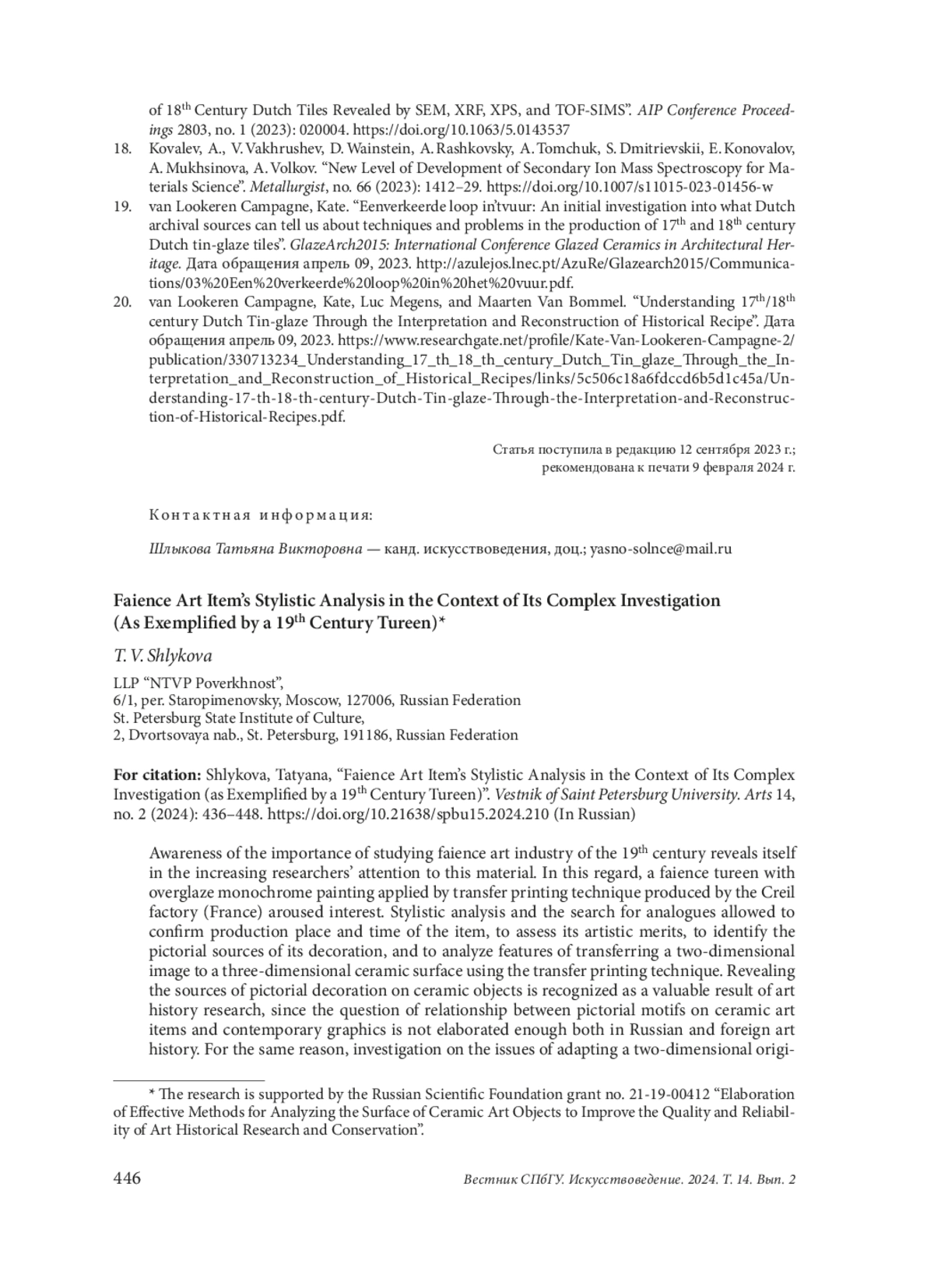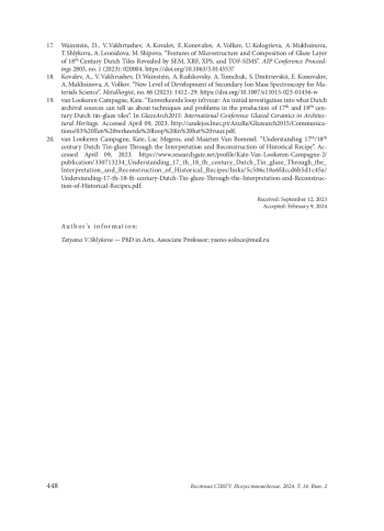 20. van Lookeren Campagne, Kate, Luc Megens, and Maarten Van Bommel. “Understanding 17th/18th century Dutch Tin-glaze Through the Interpretation and Reconstruction of Historical Recipe”. Дата обращения апрель 09, 2023. https://www.researchgate.net/profile/Kate-Van-Lookeren-Campagne-2/publication/330713234_Understanding_17_th_18_th_century_Dutch_Tin_glaze_Through_the_Interpretation_and_Reconstruction_of_Historical_Recipes/links/5c506c18a6fdccd6b5d1c45a/Understanding-17-th-18-th-century-Dutch-Tin-glaze-Through-the-Interpretation-and-Reconstruction-of-Historical-Recipes.pdf.