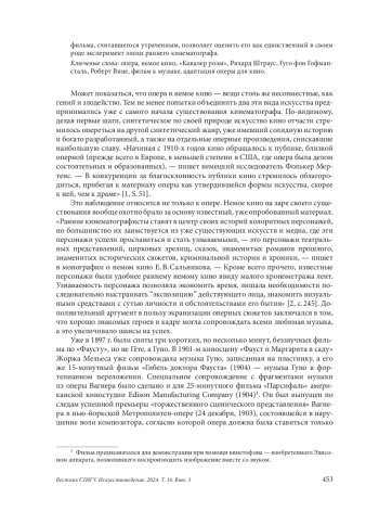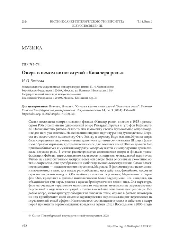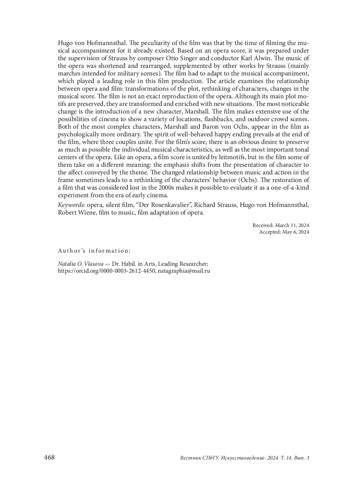 Статья посвящена истории создания фильма «Кавалер розы», снятого в 1925 г. режиссером Робертом Вине по одноименной опере Рихарда Штрауса и Гуго фон Гофмансталя. Особенностью фильма стало то, что к моменту съемок музыкальное сопровождение для него уже имелось. На основании оперной партитуры под руководством Штрауса его подготовили композитор Отто Зингер и дирижер Карл Альвин. Музыка оперы была сокращена и перекомпонована, дополнена другими сочинениями Штрауса (главным образом маршами, предназначавшимися для военных сцен). Фильм должен был приспосабливаться к музыкальному ряду, которому в этой кинопродукции принадлежала ведущая роль. В статье рассматривается соотношение оперы и фильма: трансформации фабулы, переосмысление характеров, изменения музыкальной партитуры. Фильм не является точным воспроизведением оперы. Хотя ее основные сюжетные мотивы сохранены, они преобразованы и обогащены новыми ситуациями. Самое заметное изменение — введение нового персонажа, Маршала. В фильме широко использованы возможности кино для показа разнообразных мест действия, флешбэков, массовых сцен на открытом воздухе. Оба наиболее сложных персонажа, Маршальша и Барон фон Окс, предстают в фильме психологически более заурядными. Его концовка, где объединяются три пары, решена в духе добропорядочного хеппи-энда. Для партитуры фильма очевидно стремление максимально сохранить музыкальные характеристики персонажей и отдельных ситуаций, а также важнейшие тональные центры оперы. Подобно опере, кинопартитуру объединяют сквозные темы, однако в фильме некоторые из них приобретают иной смысл: с характеристики персонажа акцент переносится на передаваемый темой аффект. Изменившееся соотношение музыки и действия в кадре порой приводит к переосмыслению поведения героев (Окс). Воссоздание в 2000-е годы фильма, считавшегося утраченным, позволяет оценить его как единственный в своем роде эксперимент эпохи раннего кинематографа