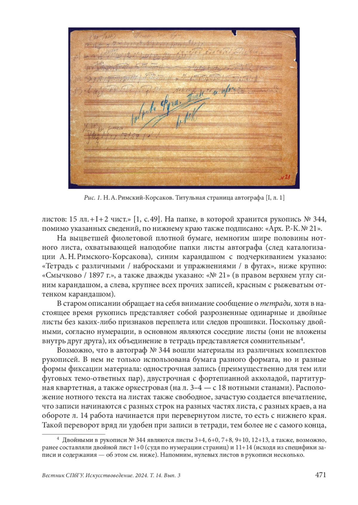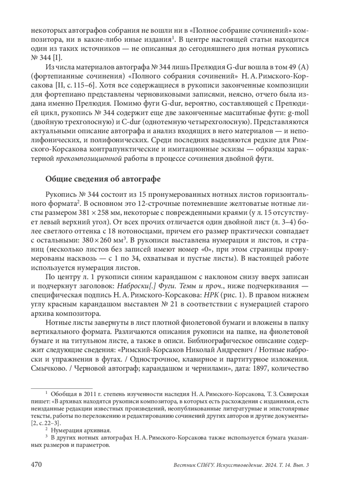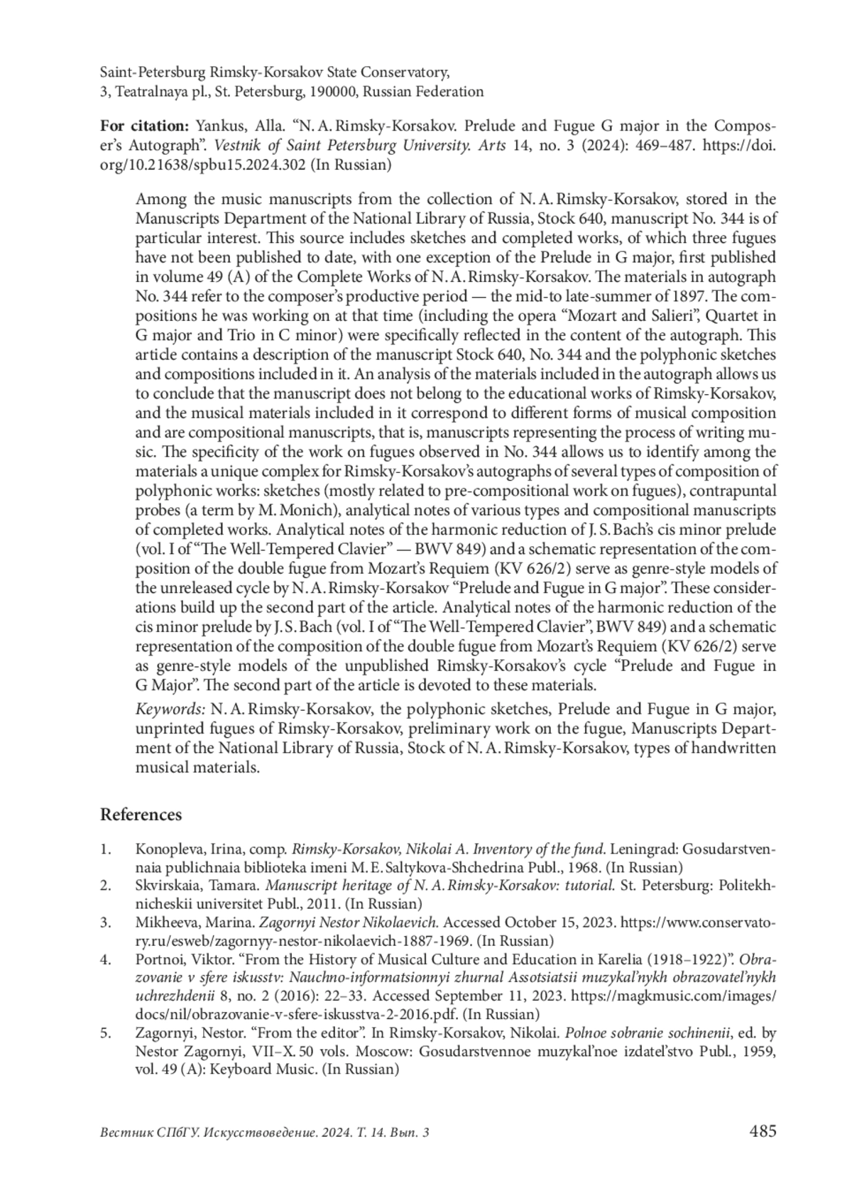 Среди нотных материалов фонда Н. А. Римского-Корсакова, хранящегося в Отделе рукописей Российской национальной библиотеки, вызывает особый интерес рукопись No 344. Этот источник включает эскизы и законченные сочинения, из которых три фуги до настоящего времени не изданы. Исключение составляет Прелюдия G-dur, впервые опубликованная в томе 49 (А) «Полного собрания сочинений» Н. А. Римского-Корсакова. Записи автографа No 344 относятся к плодотворному периоду творчества композитора — середине — концу лета 1897 г. Сочинения, работа над которыми шла в это время (в том числе опера «Моцарт и Сальери», Квартет G-dur и Трио c-moll), нашли специфическое отражение в содержании автографа. Настоящая публикация включает анализ рукописи Ф. 640 No 344 и входящих в нее полифонических эскизов и композиций. Изучение эскизов и законченных сочинений данного автографа позволяет сделать вывод о том, что он не относится к учебным работам Римского-Корсакова, а записи в этом источнике соответствуют разным формам творческого процесса и представляют собой композиционные рукописи. Наблюдаемая в рукописи No 344 специфика сочинения полифонических композиций позволяет выделить среди материалов уникальный для автографов Римского-Корсакова комплекс нескольких разновидностей записей полифонических сочинений: эскизы (по большей части относящиеся к прекомпозиционной работе над фугами), контрапунктические пробы (термин М. Монич), аналитические материалы разных видов и фиксация полностью законченных сочинений. Во второй части статьи планируется представить специфически записанные в рукописи No 344 прелюдию И. С. Баха cismoll (I т. «Хорошо темперированного клавира» — BWV 849) и фугу из II части Реквиема Моцарта (KV 626/2) как жанрово-стилевые модели полифонического цикла Н. А. Римского-Корсакова «Прелюдия и фуга G-dur»