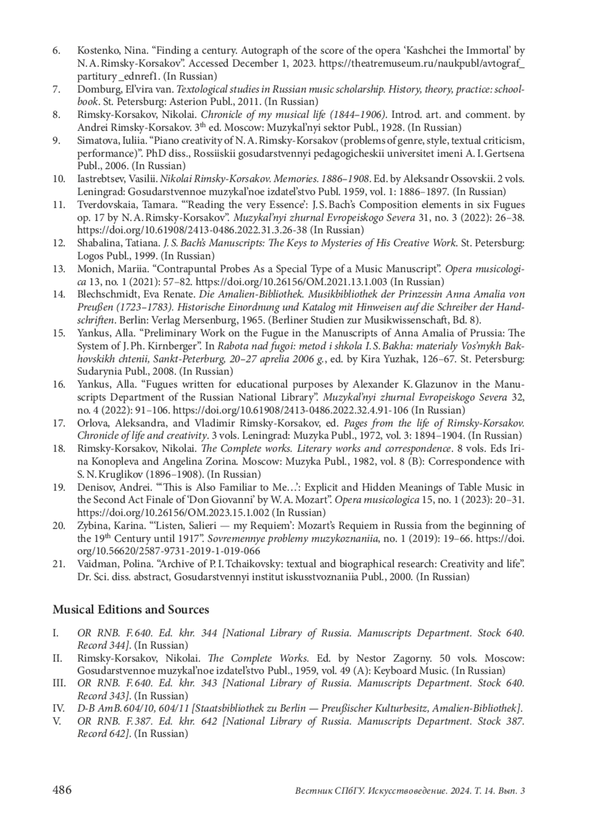 11. Твердовская, Тамара. “‘Дойти до самой сути’: баховские композиционные элементы в шести фугах ор. 17 Н. А. Римского-Корсакова”. Музыкальный журнал Европейского Севера 31, no. 3 (2022): 26-38. DOI: 10.61908/2413-0486.2022.31.3.26-38 EDN: KBOJMC