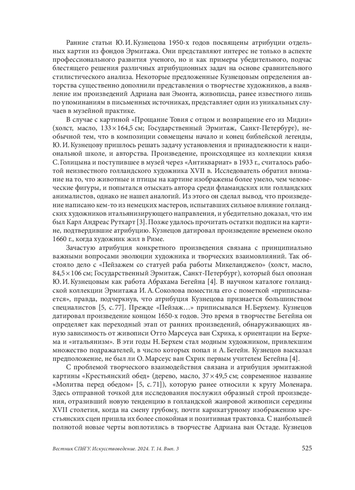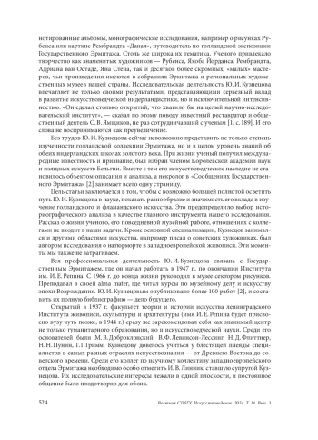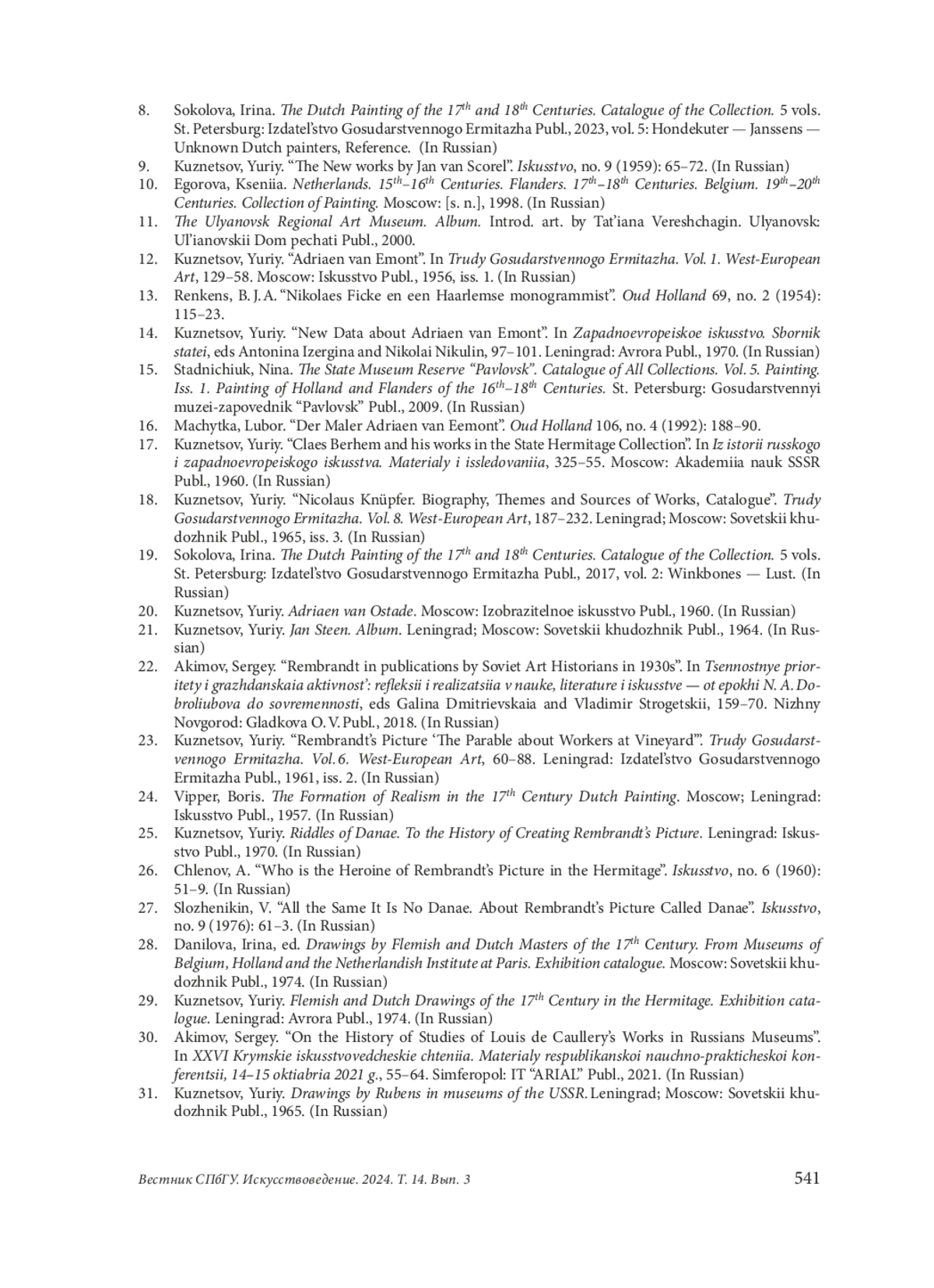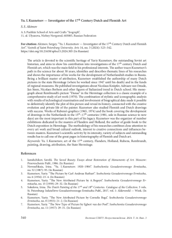 Публикации Юрия Ивановича Кузнецова (1920–1984), посвященные искусству Фландрии и Голландии XVII столетия, чрезвычайно разнообразны с точки зрения жанра искусствоведческого текста: атрибуционные статьи, каталоги выставок и ан- 524 Вестник СПбГУ. Искусствоведение. 2024. Т. 14. Вып. 3 нотированные альбомы, монографические исследования, например о рисунках Рубенса или картине Рембрандта «Даная», путеводитель по голландской экспозиции Государственного Эрмитажа. Столь же широка их тематика. Ученого привлекало творчество как знаменитых художников — Рубенса, Якоба Йорданса, Рембрандта, Адриана ван Остаде, Яна Стена, так и десятков более скромных, «малых» мастеров, чьи произведения имеются в собраниях Эрмитажа и региональных художественных музеев нашей страны. Исследовательская деятельность Ю. И. Кузнецова впечатляет не только своими результатами, представляющими серьезный вклад в развитие искусствоведческой нидерландистики, но и исключительной интенсивностью. «Он сделал столько открытий, что хватило бы на целый научно-исследовательский институт», — сказал по этому поводу известный реставратор и общественный деятель С. В. Ямщиков, не раз сотрудничавший с ученым [1, с. 189]. И его слова не воспринимаются как преувеличение