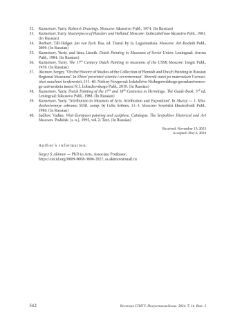37. Акимов, Сергей. “Из истории изучения коллекций фламандской и голландской живописи XVII столетия в региональных музеях России”. В сб. Жизнь провинции: история и современность. Сб. ст. по материалам Всерос. науч. конф., 151-60. Н. Новгород: Изд-во Нижегород. гос. ун-та им. Н. И. Лобачевского, 2019.