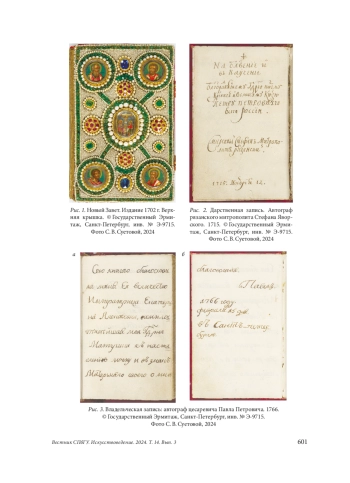 В коллекции Эрмитажа хранится Новый Завет кириллической печати в драгоценном окладе (рис. 1), история которого связана с царской семьей (аннотация О. Г. Костюк) [1, с. 330]1. Книга была издана в феврале 1702 г. на московском Печатном дворе и, согласно записи на верхнем форзаце (рис. 2), преподнесена 12 ноября 1715 г. 2 рязанским митрополитом Стефаном «на благословение и в научение» царевичу Петру Петровичу — сыну Петра I и Екатерины, появившемуся на свет 28 октября 1715 г.3 Другие имеющиеся в книге владельческие записи говорят о том, что до 1881 г. она оставалась в императорской семье: принадлежала Павлу I (рис. 3), Александру I [2, c. 1]4 и Александру II, после смерти которого была вложена в ризницу Большого собора Зимнего дворца [3, с. 30–1]. Эти записи представляют собой образцы детских почерков цесаревичей Павла Петровича и Александра Николаевича5
