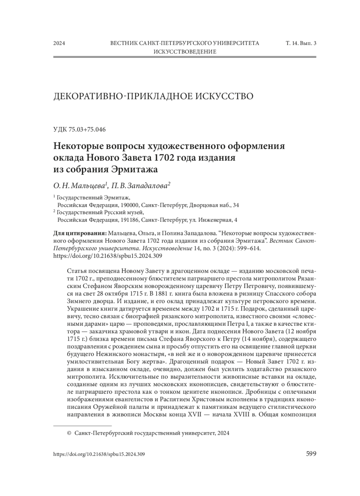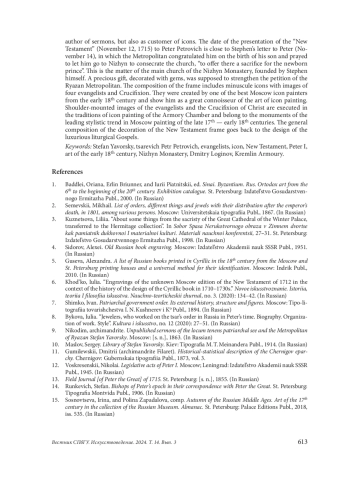 Статья посвящена Новому Завету в драгоценном окладе — изданию московской печати 1702 г., преподнесенному блюстителем патриаршего престола митрополитом Рязанским Стефаном Яворским новорожденному царевичу Петру Петровичу, появившемуся на свет 28 октября 1715 г. В 1881 г. книга была вложена в ризницу Спасского собора Зимнего дворца. И издание, и его оклад принадлежат культуре петровского времени. Украшение книги датируется временем между 1702 и 1715 г. Подарок, сделанный царевичу, тесно связан с биографией рязанского митрополита, известного своими «словесными дарами» царю — проповедями, прославляющими Петра I, а также в качестве кти - тора — заказчика храмовой утвари и икон. Дата поднесения Нового Завета (12 ноября 1715 г.) близка времени письма Стефана Яворского к Петру (14 ноября), содержащего поздравления с рождением сына и просьбу отпустить его на освящение главной церкви будущего Нежинского монастыря, «в ней же и о новорожденном царевиче принесется умилостивительная Богу жертва». Драгоценный подарок — Новый Завет 1702 г. издания в изысканном окладе, очевидно, должен был усилить ходатайство рязанского митрополита. Исключительные по выразительности живописные вставки на окладе, созданные одним из лучших московских иконописцев, свидетельствуют о блюстителе патриаршего престола как о тонком ценителе иконописи. Дробницы с оплечными изображениями евангелистов и Распятием Христовым исполнены в традициях иконописания Оружейной палаты и принадлежат к памятникам ведущего стилистического направления в живописи Москвы конца XVII — начала XVIII в. Общая композиция декорации оклада Нового Завета, предназначенного для личного использования, восходит к оформлению роскошных богослужебных Евангелий.