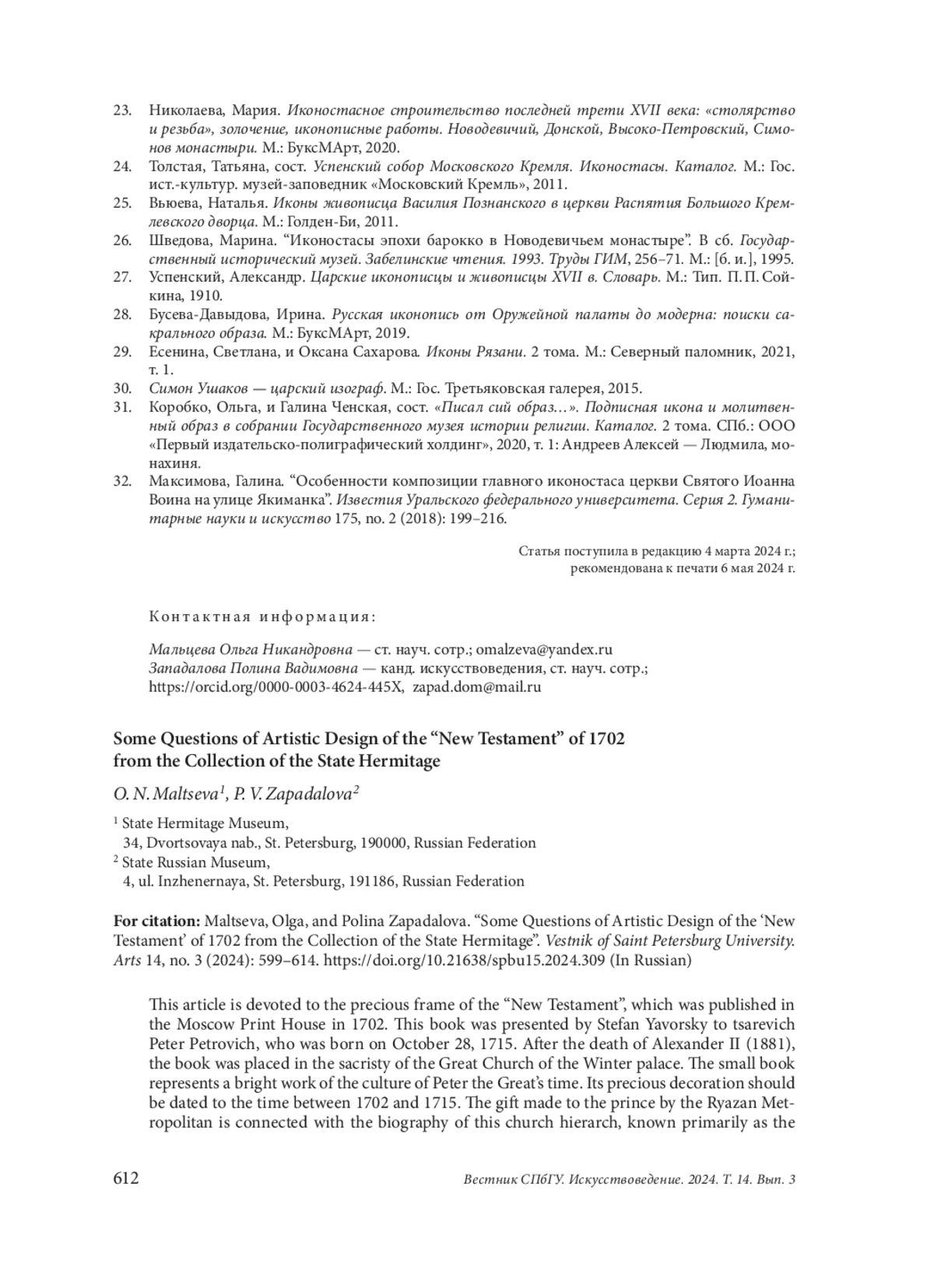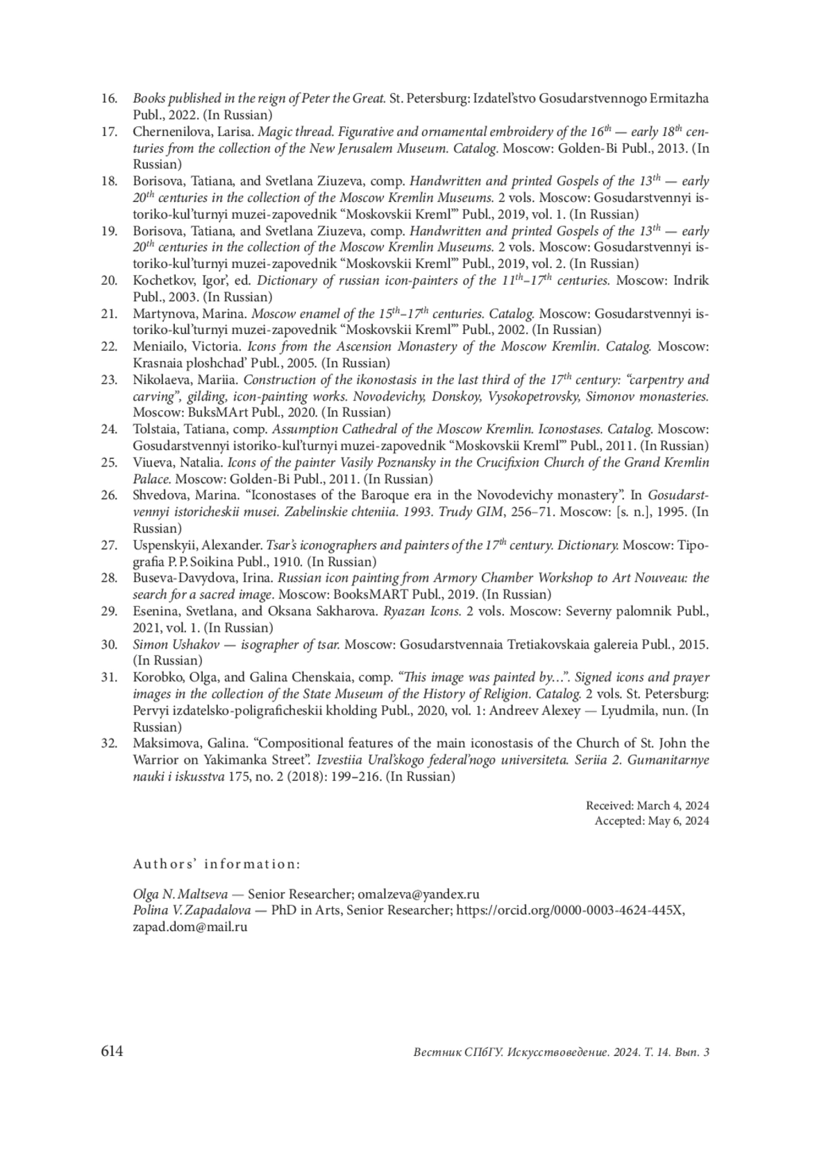 15. Сосновцева, Ирина, и Полина Западалова, сост. Осень русского Средневековья. Искусство XVII века в собрании Русского музея. Альманах. СПб.: Palace Editions, 2018, вып. 535.
