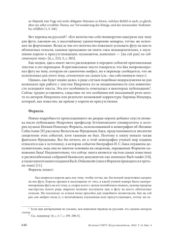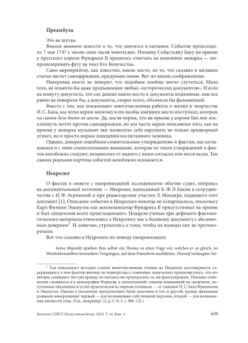 В течение многих лет в баховедении бытует мнение о том, что на приеме у прусского короля Фридриха II «Великого» Иоганн Себастьян Бах, получив повеление сымпровизировать шестиголосную фугу на тему монарха, публично отказался от задания, избрав для этого другую тему. В статье подвергаются сомнению ряд действий И. С. Баха на приеме у короля (в частности, его обращение к монарху с просьбой дать тему для импровизации, а также объяснение, почему тема, предложенная Фридрихом II, не годится для шестиголосной фуги), которые приписываются ему авторами научных работ якобы с опорой на документальные источники. На их основе в научной литературе делается сомнительный вывод о замене Бахом королевской темы на неизвестную другую. При этом неизвестной остается не только сама тема, но и ее автор. Однако существует значительное число фактов, заставляющих поставить под вопрос многие детали этого сюжета, а вместе с ними и его достоверность. Изучение подробностей контекста происходящих событий в условиях двора Фридриха II и сопоставление их с Некрологом и газетными публикациями того времени позволило сделать вывод о том, что импровизацию шестиголосной фуги на королевскую тему Бах выполнил без какого-либо на то указания с чьей-либо стороны. Что же касается «замены» одной темы другой, то, как показывает анализ обстоятельств, подобного факта в потсдамских событиях 7 и 8 мая 1747 г., вероятнее всего, не было