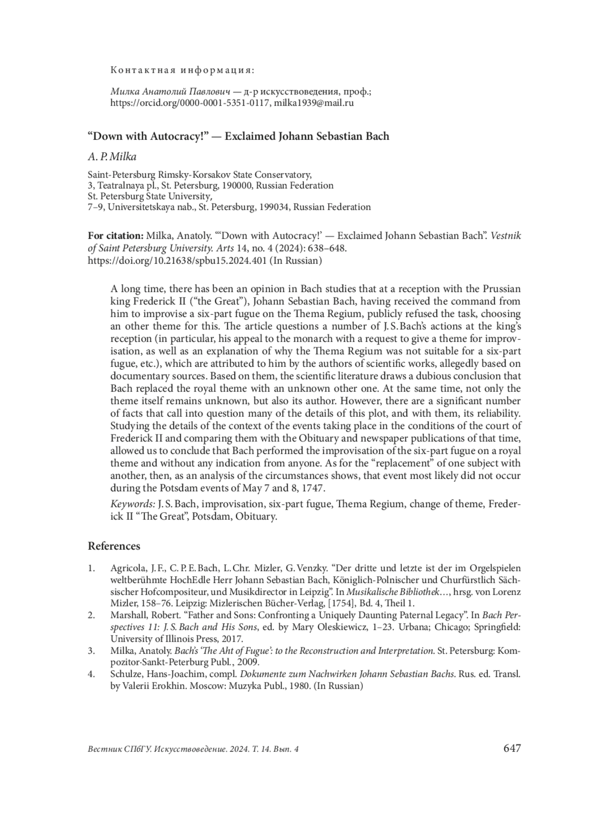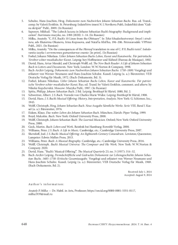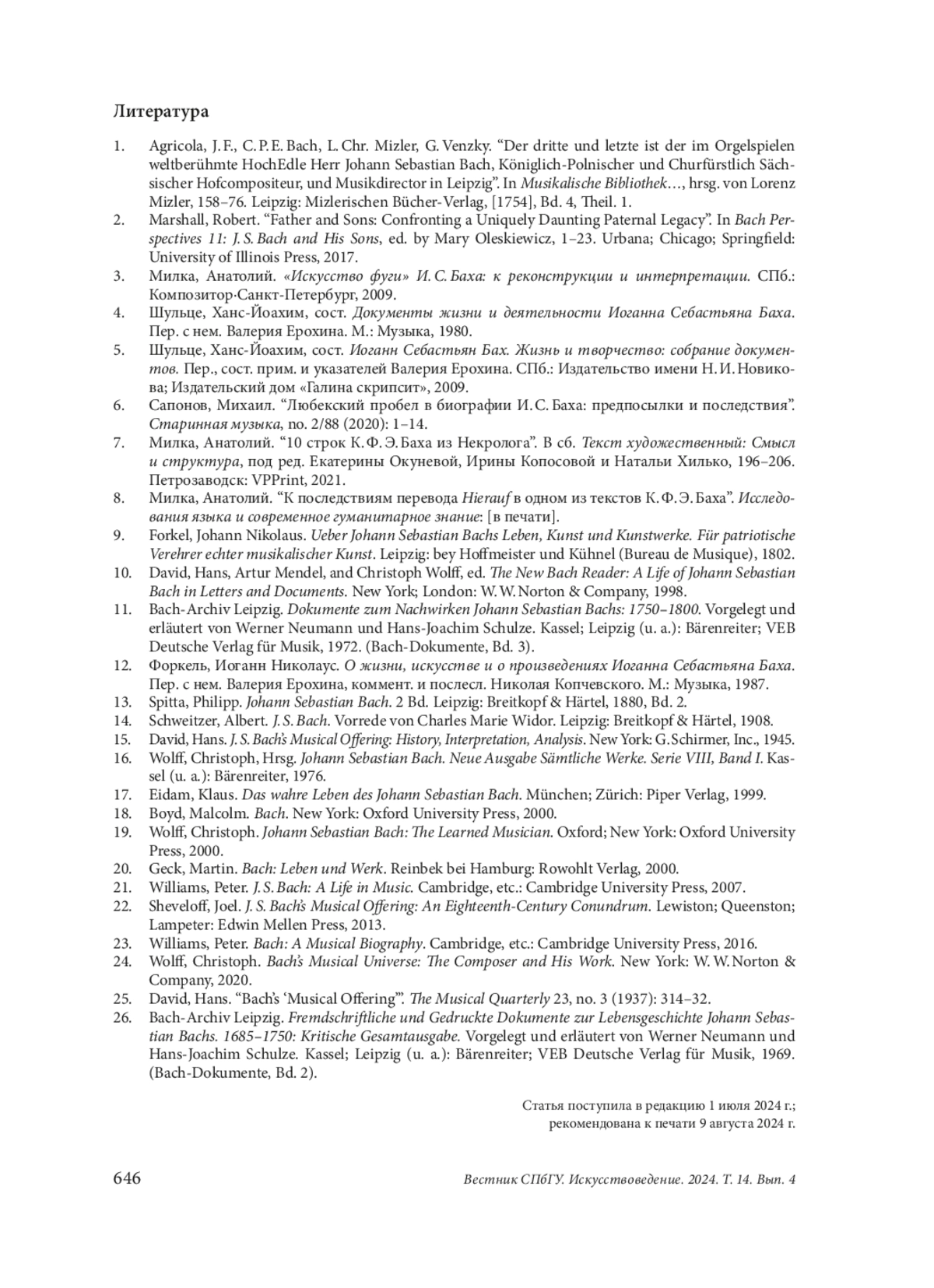 3. Милка, Анатолий. “Искусство фуги” И. С. Баха: к реконструкции и интерпретации. СПб.: Композитор·Санкт-Петербург, 2009. EDN: QSBINN