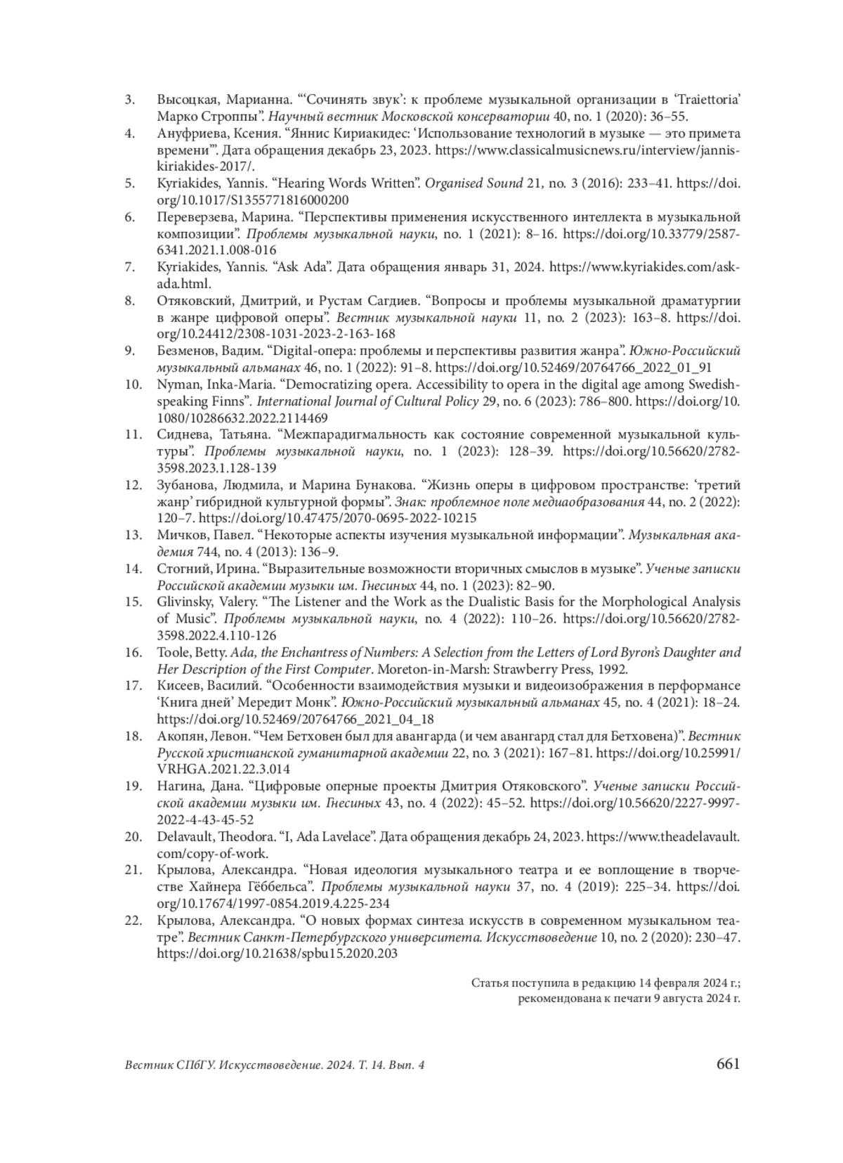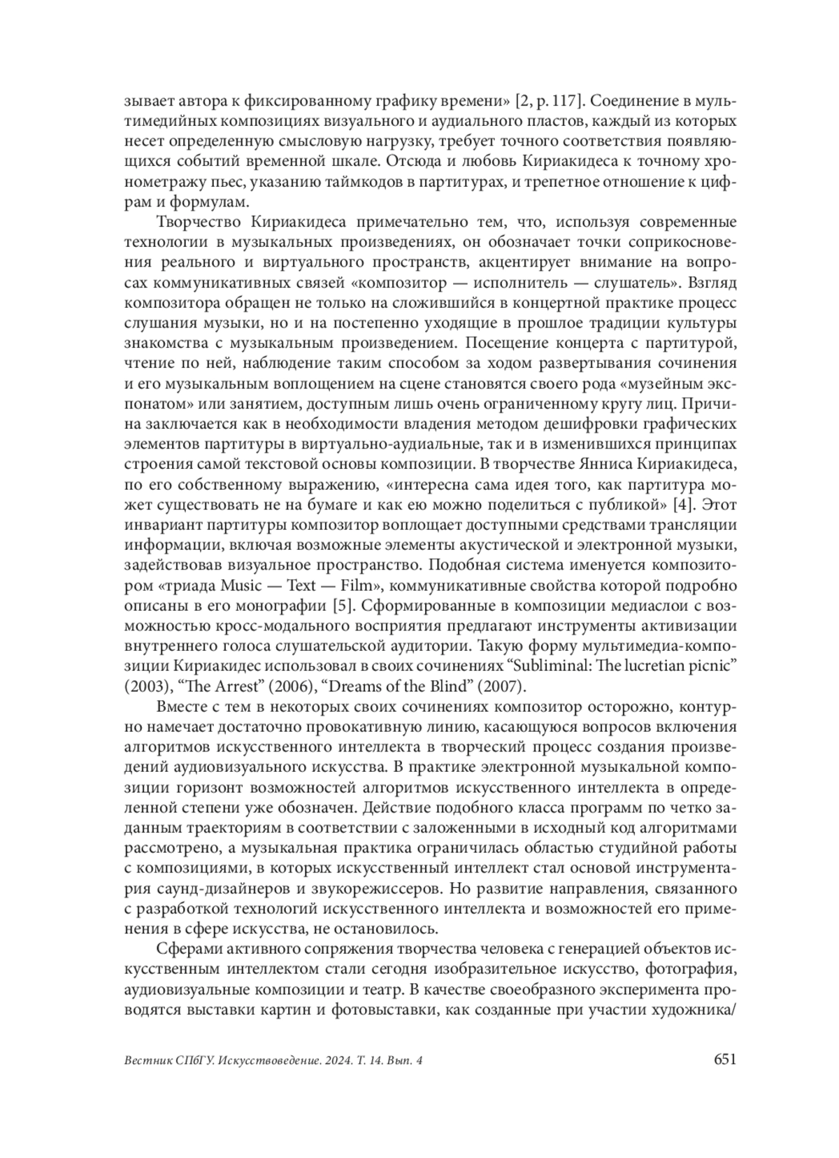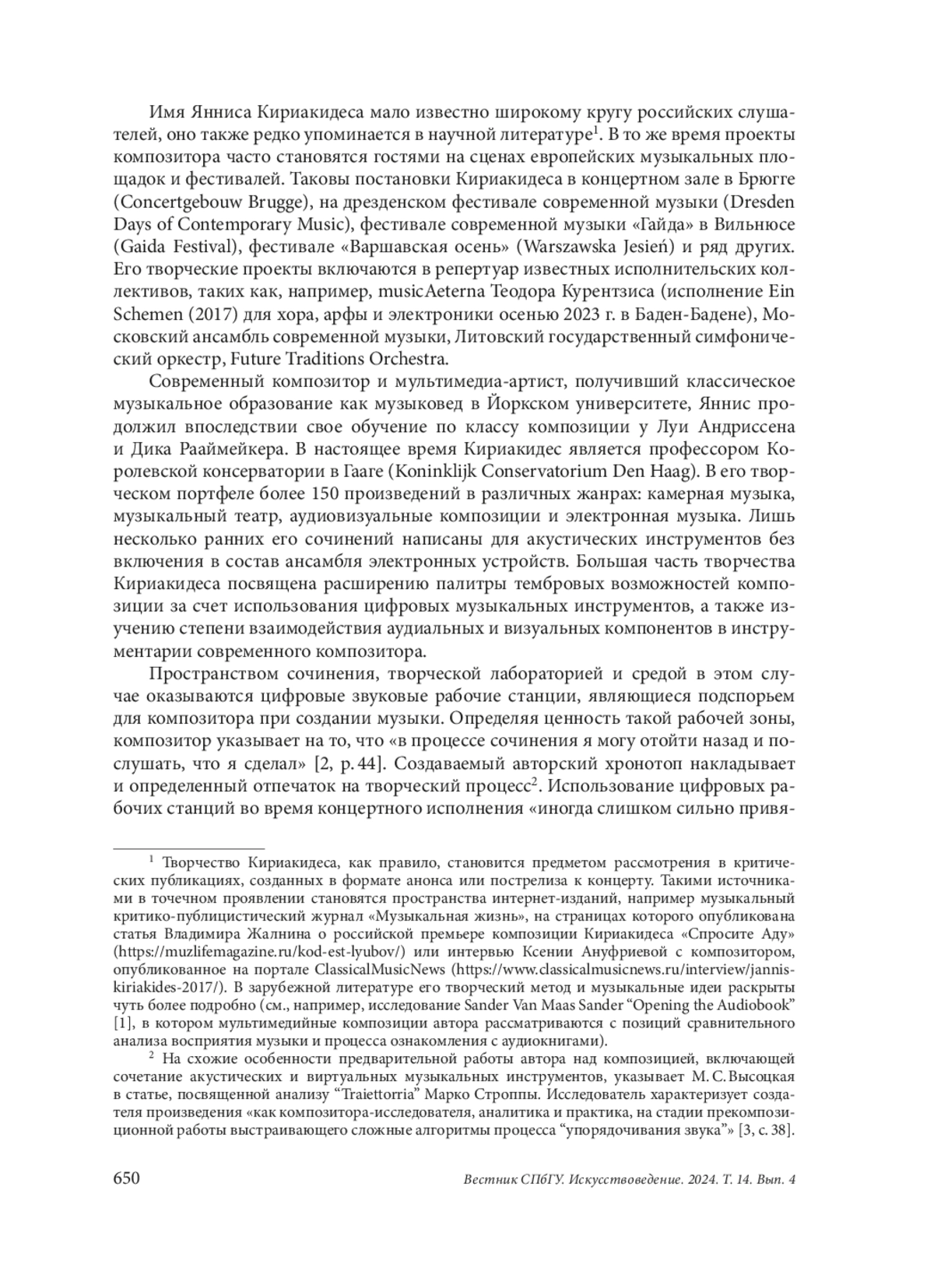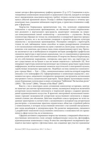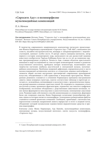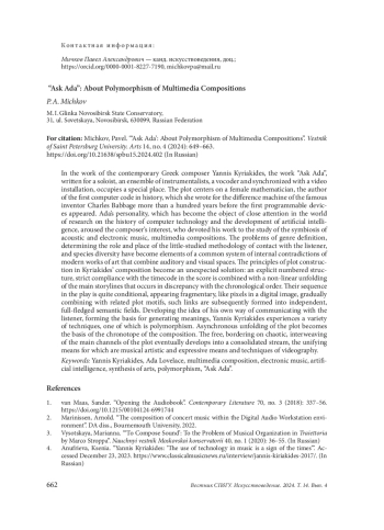 В творчестве современного нидерландского композитора греческого происхождения Янниса Кириакидеса произведение «Спросите Аду» (“Ask Ada”), написанное для солиста, ансамбля инструменталистов, вокодера и синхронизированное с видеоинсталляцией, занимает особое место. В центре сюжета женщина-математик, автор первого в истории компьютерного кода, написанного ею для разностной машины известного изобретателя Чарльза Бэббиджа более чем за сто лет до появления первых программируемых устройств. Личность Ады, ставшая объектом пристального внимания в мире исследований по теме истории компьютерной техники и развития искусственного интеллекта, пробудила интерес композитора, посвятившего свое творчество изучению симбиоза акустической и электронной музыки, мультимедийным композициям. Проблемы жанровой дефиниции, определения роли и места малоисследованной методологии контакта со слушателем, видовое многообразие — элементы общей системы внутренних противоречий современных произведений искусства, объединяющих в себе аудиальные и визуальные пространства. Неожиданным решением становятся в сочинении Кириакидеса принципы выстраивания сюжета: явная номерная структура, строгое соответствие таймкоду в партитуре сочетаются с нелинейным, возникающим в несоответствии с хронологическим порядком развертыванием основных сюжетных линий. Их очередность следования в пьесе достаточно условна, проявляясь фрагментарно, отрывочно, как пиксели в цифровом изображении, постепенно объединяясь с родственными сюжетными мотивами, такие звенья формируются впоследствии в самостоятельные, полноценные смысловые поля. Развивая идею собственного способа коммуникации со слушателем, формируя базис для генерации смыслов, Яннис Кириакидес испытывает разнообразные приемы, одним из которых является полиморфизм. Асинхронное развертывание фабулы становится основой хронотопа сочинения. Свободное, граничащее с хаотичностью, переплетение основных направлений сюжета перерастает в итоге в сводный поток, объединяют который музыкальные художественно-выразительные средства и приемы видеографии