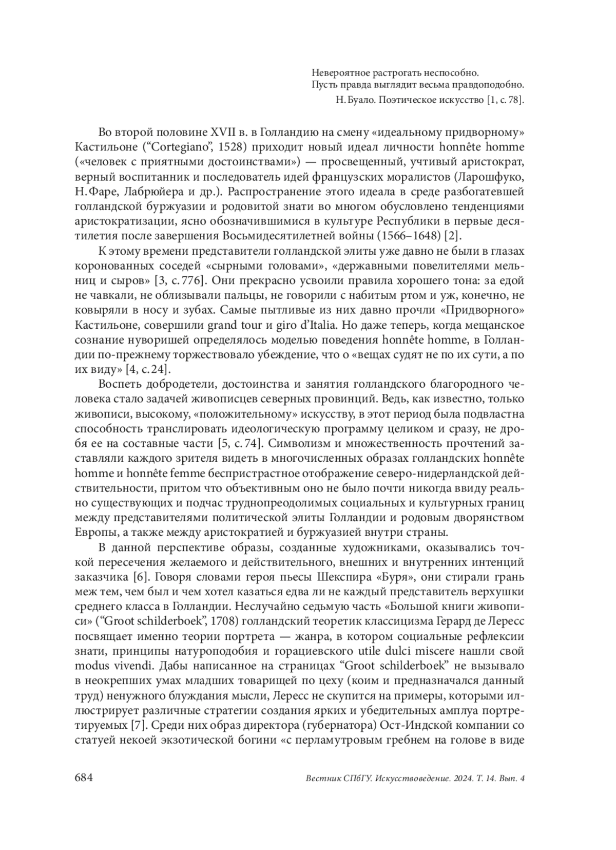 Во второй половине XVII в. в Голландию на смену «идеальному придворному» Кастильоне (“Cortegiano”, 1528) приходит новый идеал личности honnête homme («человек с приятными достоинствами») — просвещенный, учтивый аристократ, верный воспитанник и последователь идей французских моралистов (Ларошфуко, Н. Фаре, Лабрюйера и др.). Распространение этого идеала в среде разбогатевшей голландской буржуазии и родовитой знати во многом обусловлено тенденциями аристократизации, ясно обозначившимися в культуре Республики в первые десятилетия после завершения Восьмидесятилетней войны (1566–1648) [2]