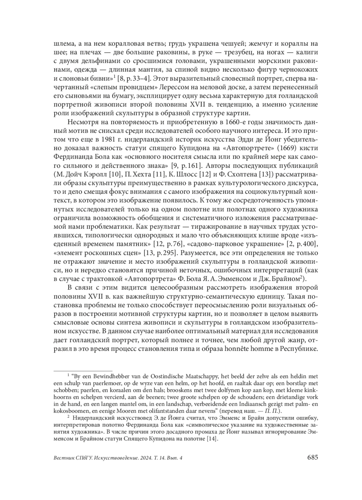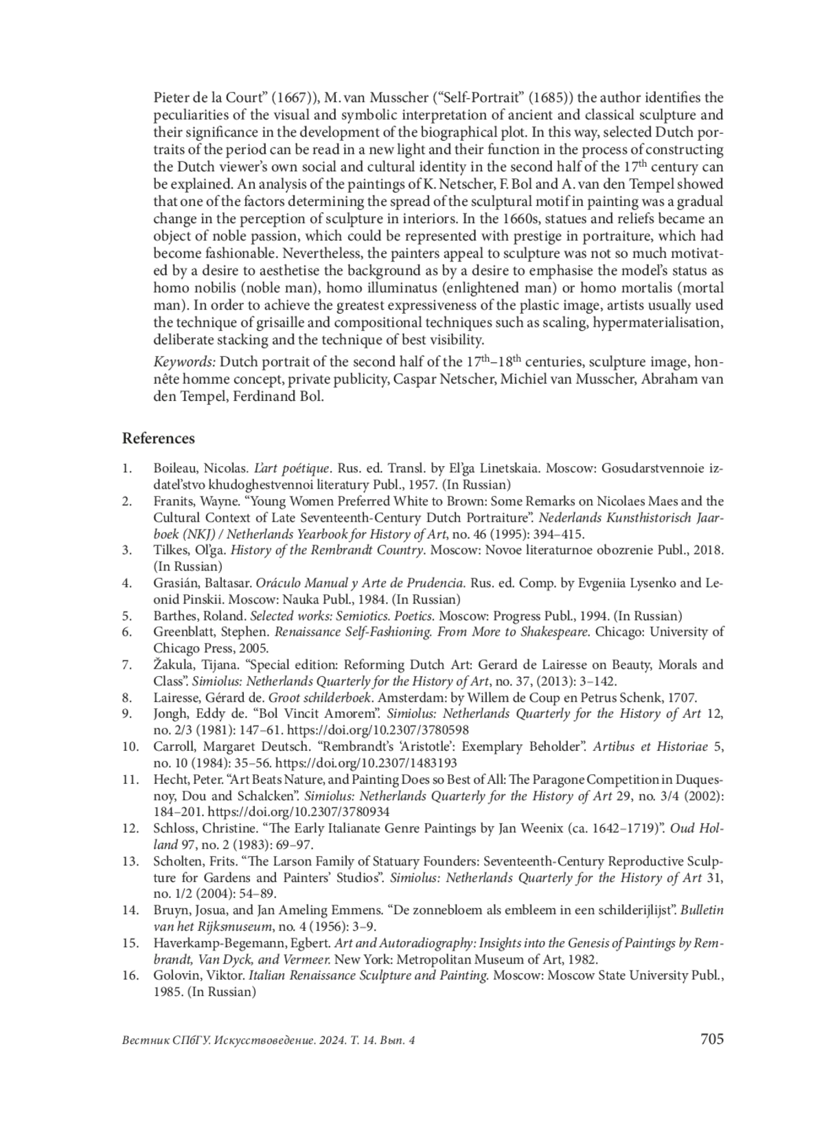 Предпринята попытка изучить роль скульптурных образов в голландском портрете второй половины XVII в. На материале наиболее типичных произведений этого жанра кисти К. Нетшера («Портрет Марии II Стюарт», 1683, «Портрет Гертруды Хёйгенс», 1668), Ф. Бола («Маргарита Трип в образе Минервы, обучающая свою сестру Анну Марию Трип», 1663), А. ван ден Темпела («Портрет Питера де ла Кура», 1667), М. ван Мюсхера («Автопортрет», 1685) автором выявляются особенности визуальной и символической интерпретации античной и антикизированной скульптуры и ее значение в развитии биографического сюжета. Данный подход позволил по-новому прочесть избранные голландские портреты этого периода, а также прояснить их функцию в процессе конструирования голландским зрителем второй половины XVII в. собственной социальной и культурной идентичности. Анализ полотен К. Нетшера, Ф. Бола, А. ван ден Темпела и М. ван Мюсхера показал, что одним из факторов, обусловивших распространение скульптурного мотива в живописи, было постепенное изменение восприятия скульптуры в интерьере. К 1660-м годам статуи и рельефы превращаются в предмет благородного увлечения, который престижно репрезентировать, особенно в портретной живописи. Тем не менее обращение живописцев к скульптуре было мотивировано даже не столько стремлением к эстетизации фона, сколько желанием подчеркнуть статус модели как homo nobilis (человека благородного), homo illuminatus (человека просвещенного) или homo mortalis (человека смертного). Для достижения наибольшей выразительности пластического образа художники, как правило, использовали технику гризайль и композиционные приемы масштабирования, гиперматериализации, осознанного нагромождения, а также прием наилучшей обозримости.