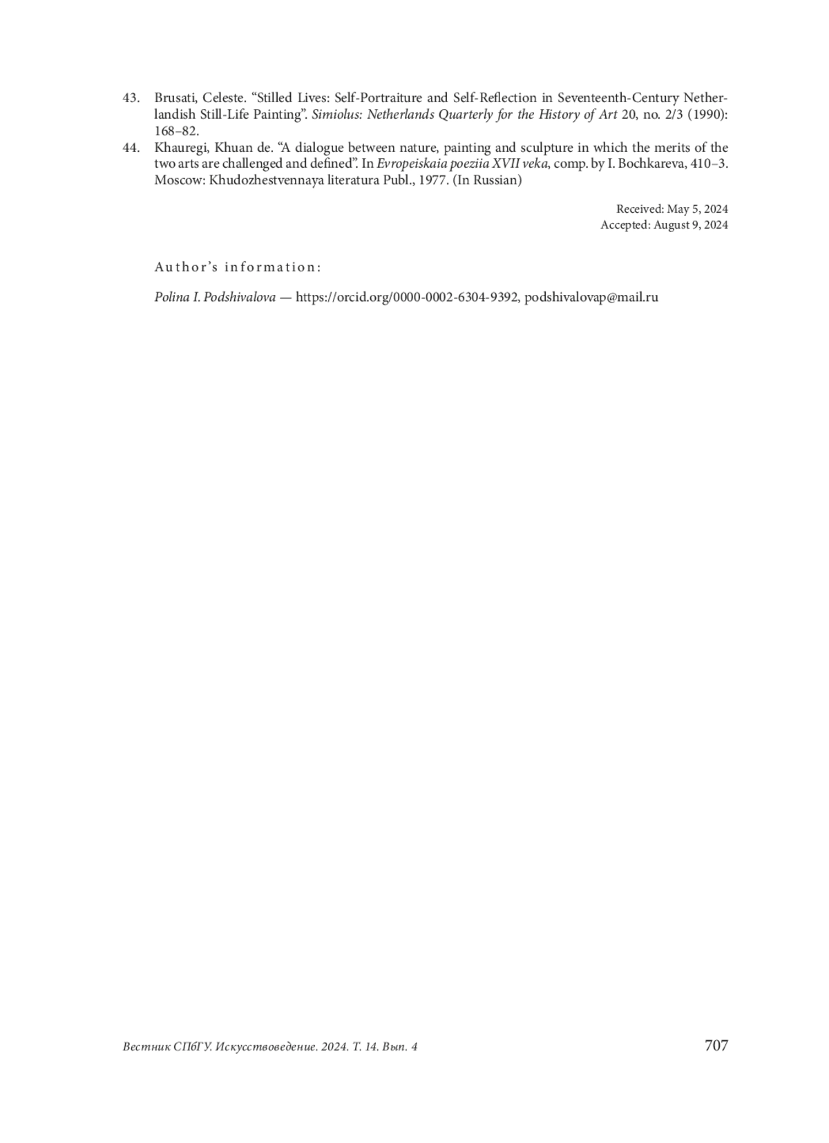 43. Brusati, Celeste. “Stilled Lives: Self-Portraiture and Self-Reflection in Seventeenth-Century Netherlandish Still-Life Painting”. Simiolus: Netherlands Quarterly for the History of Art 20, no. 2/3 (1990): 168-82.