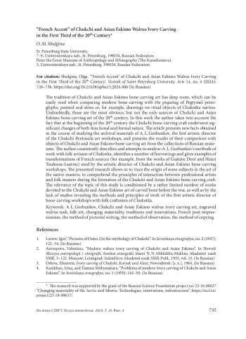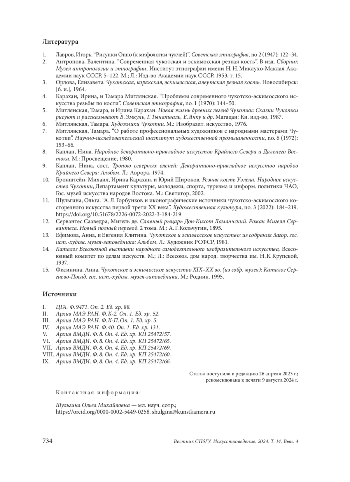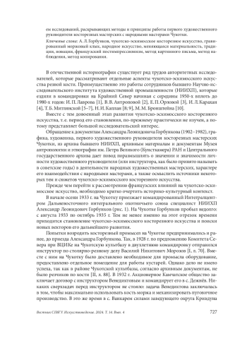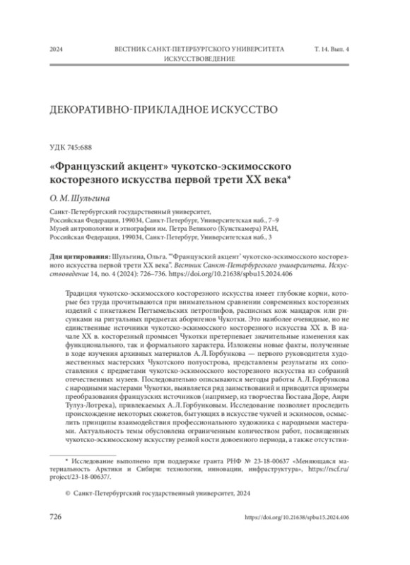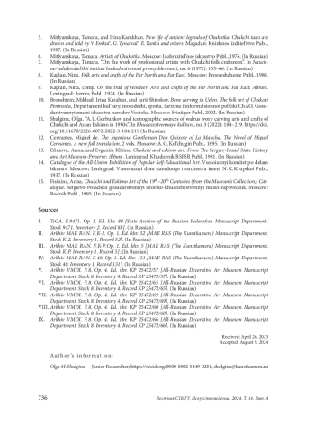 11. Шульгина, Ольга. “А. Л. Горбунков и иконографические источники чукотско-эскимосского косторезного искусства первой трети ХХ века”. Художественная культура, no. 3 (2022): 184-219. DOI: 10.51678/2226-0072-2022-3-184-219 EDN: TWVLUA