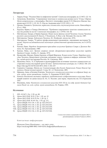 7. Митлянская, Тамара. “О работе профессиональных художников с народными мастерами Чукотки”. Научно-исследовательский институт художественной промышленности, no. 6 (1972): 153-66.