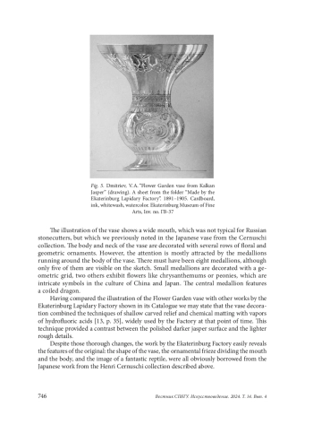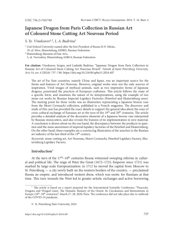The art of Far East countries, namely China and Japan, was an important source for the forms and features of Art Nouveau. However, original works were not the only sources of inspiration. Vivid images of mythical animals, such as two impressive forms of Japanese dragons, penetrated the practices of European craftsmen. This article follows the route of a specific form, and examines the nature of its interpretations, using the example of two stone-cut works by Russian Imperial Lapidary Factories (Peterhof and Ekaterinburg ones). The starting point for these works was an illustration representing a Japanese bronze vase from the Henri Cernuschi collection, published in a French magazine. The discovery and study of this case has provided the exact details to support the general idea about the ways of cross-cultural exchange of Eurasian art at the turn of the 19 th and 20 th centuries. The article provides a detailed analysis of the decorative elements of a Japanese bronze vase interpreted by Russian stonecutters, and also reveals the features of its implementation in new material. A conclusion is drawn about on the one hand, the discrepancy between the products in question and the main assortment of imperial lapidary factories of the Peterhof and Ekaterinburg. On the other hand, these examples are a convincing illustration of the searches in the Russian art industry of the last third of the 19th century.