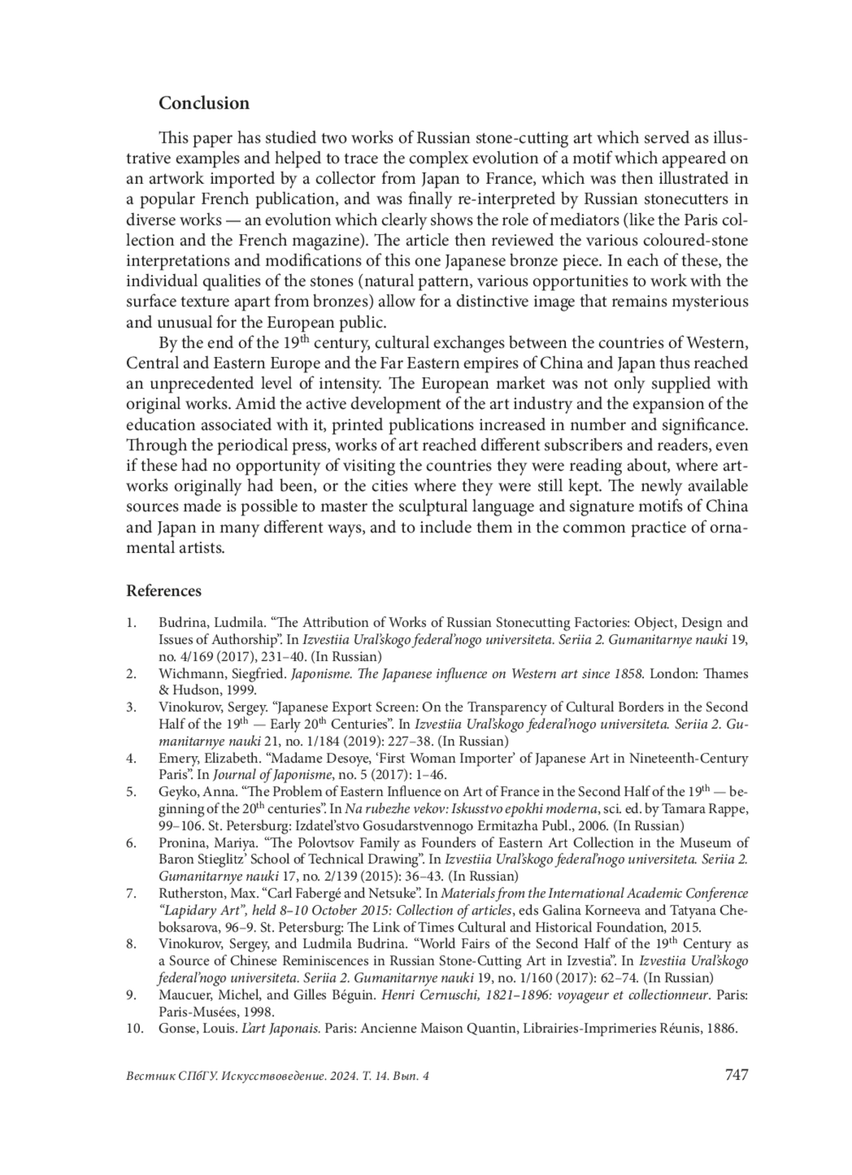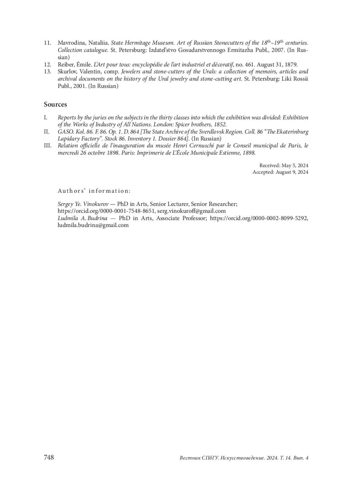 1. Budrina, Ludmila. “The Attribution of Works of Russian Stonecutting Factories: Object, Design and Issues of Authorship”. In Izvestiia Ural’skogo federal’nogo universiteta. Seriia 2. Gumanitarnye nauki 19, no. 4/169 (2017), 231-40. (In Russian).