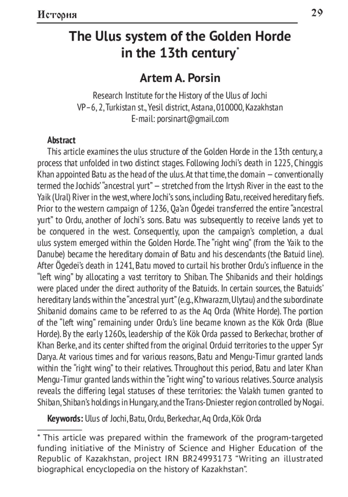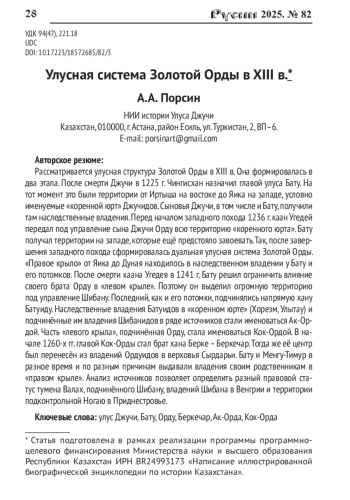 40. Порсин А.А. Джучидские владения в Газне и борьба за власть в улусе Орду на рубеже XIII-XIV веков // Stratum plus. 2025. № 5. С. 333-346.