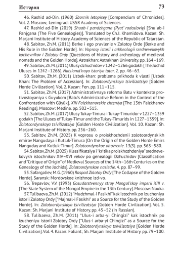 50. Сабитов Ж.М. Узбек-хан: проблема прихода к власти // Золотоордынское наследие. Казань: Фэн, 2011. С. 111-115.