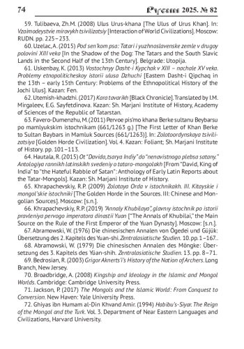 64. Хаутала Р. От “Давида, царя Индий” до “ненавистного плебса сатаны”. Антология ранних латинских сведений о татаро-монголах. Казань: Ин-т истории им. Ш.Марджани АН РТ, 2015. 496 с.