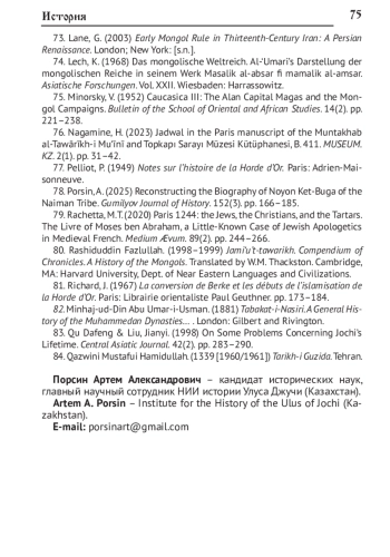 35. Порсин А.А. История Золотой Орды конца XIII - начала XIV веков в труде Рукн ад-Дина Бейбарса ал-Мансури “Зубдат ал-фикра”. Казань: Ин-т истории им. Ш. Марджани АН РТ, 2018. 276 с.