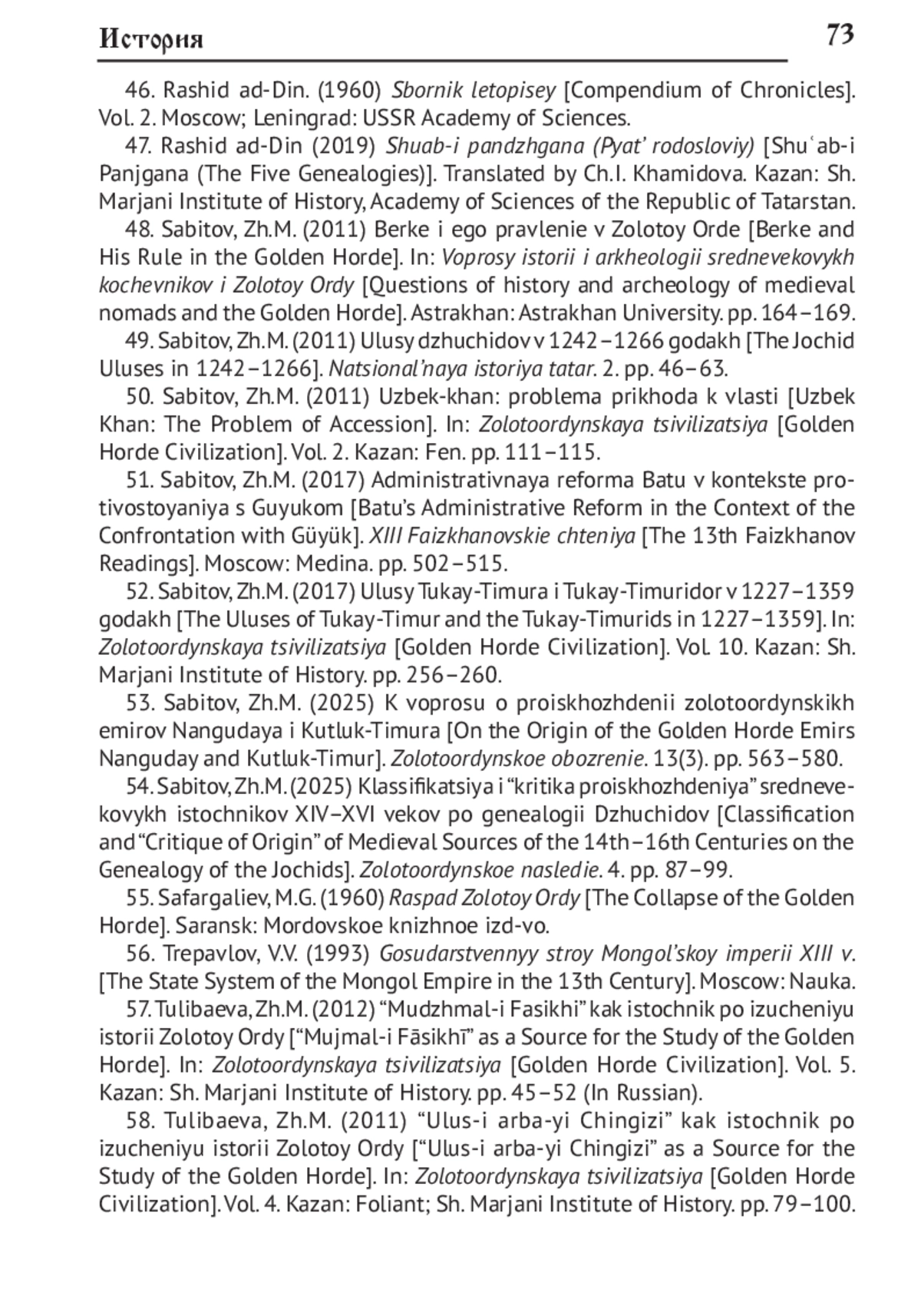 54. Сабитов Ж.М. Классификация и “критика происхождения” средневековых источников XIV-XVI веков по генеалогии Джучидов // Золотоордынское наследие. 2025. № 4. С. 87-99.