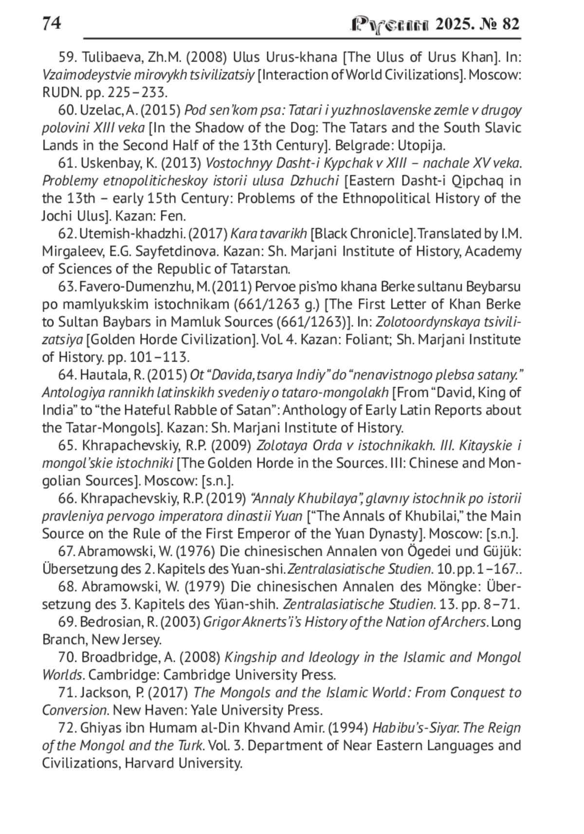 53. Сабитов Ж.М. К вопросу о происхождении золотоордынских эмиров Нангудая и Кутлук-Тимура // Золотоордынское обозрение. 2025. Т. 13, № 3. С. 563-580.
