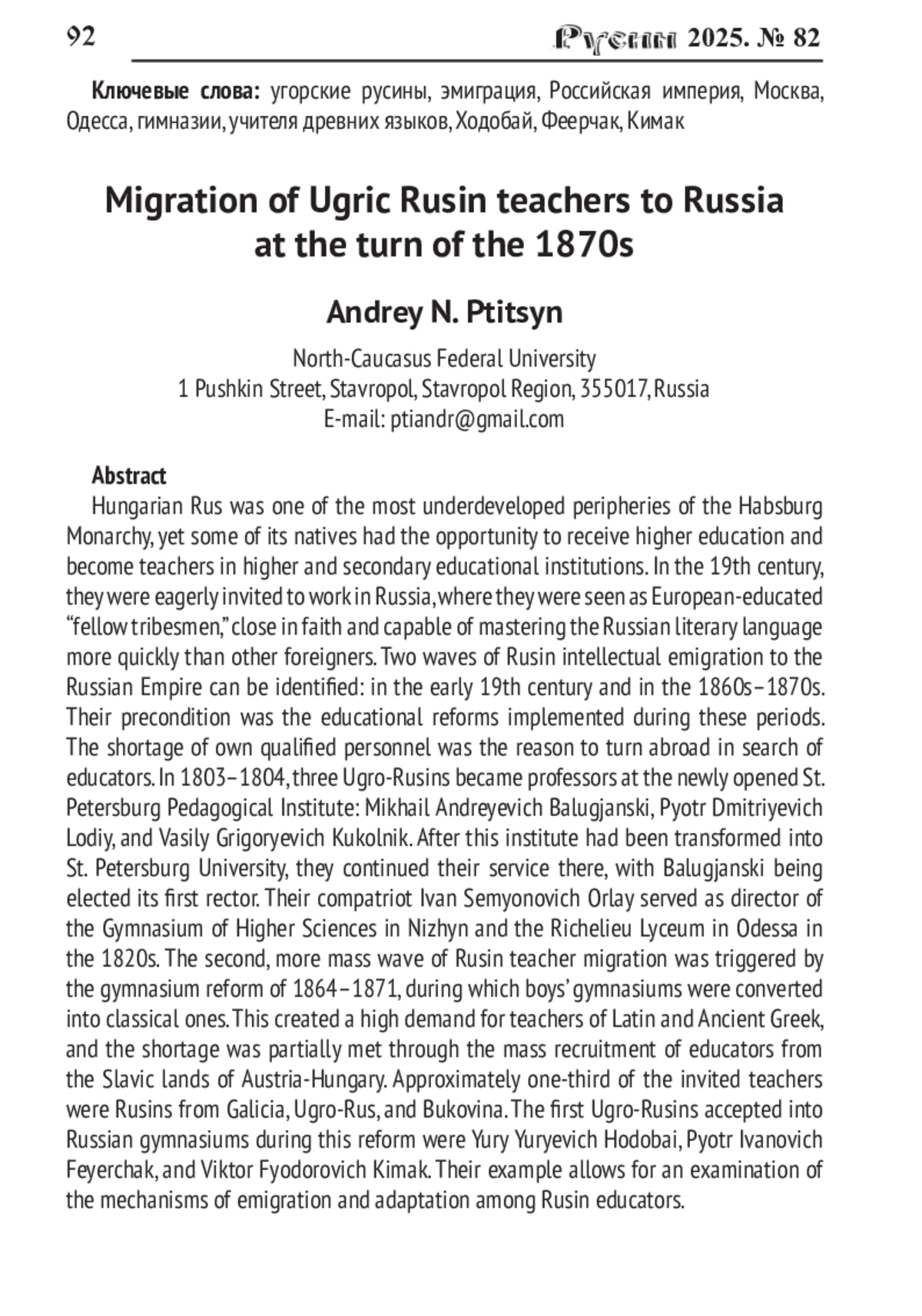 Угорская Русь была одной из отсталых окраин Габсбургской монархии, но некоторые её уроженцы имели возможность получить высшее образование и стать преподавателями высших и средних учебных заведений. В XIX в. их охотно приглашали на работу в Россию, где в них видели европейски образованных «единоплеменников», близких по вере и способных быстрее других иностранцев освоить русский литературный язык. Можно выделить две волны русинской интеллектуальной эмиграции в Российскую империю: в начале XIX в. и в 1860-1870-е гг. Их предпосылками стали проводимые в эти периоды образовательные реформы, в ходе которых создавались новые учебные заведения, педагогов для которых приходилось искать в том числе за границей. В 1803-1804 гг. Михаил Андреевич Балугьянский, Пётр Дмитриевич Лодий и Василий Григорьевич Кукольник - трое угрорусов - стали профессорами открытого в Петербурге Педагогического института. После преобразования этого института в Петербургский университет они продолжали там свою службу, причём Балугьянский был избран его первым ректором. Их земляк Иван Семёнович Орлай в 1820-е гг. был директором Гимназии высших наук в Нежине и Ришельевского лицея в Одессе. Вторая, более массовая волна переселения преподавателей-русинов была вызвана гимназической реформой 1864-1871 гг., в ходе которой мужские гимназии были преобразованы в классические. Для них потребовалось много преподавателей латинского и древнегреческого языков, и их нехватка была частично восполнена за счёт массового приглашения из славянских земель Австро-Венгрии. Около трети среди приглашённых педагогов составили русины из Галиции, Угорской Руси и Буковины. Первыми угрорусами, принятыми в российские гимназии в период гимназической реформы, стали Юрий Юрьевич Ходобай, Пётр Иванович Феерчак и Виктор Фёдорович Кимак. На их примере можно рассмотреть механизмы эмиграции и адаптации русинских педагогов.