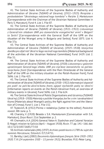 41. Центральный государственный архив органов власти и управления (ЦГАВО) Украины. Ф. 4. Оп. 1. Д. 87. Переписка с председателем “Украинского национального комитета” в Париже С. Маркотуном. 1922-1923.