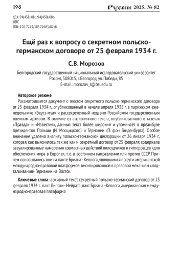 Рассматривается документ с текстом секретного польско-германского договора от 25 февраля 1934 г., опубликованный в начале апреля 1935 г. в парижском еженедельнике «Экутэ-муа» и рассекреченный недавно Российским государственным военным архивом. В отличие от аналогичного текста, опубликованного в газетах «Правда» и «Известия», данный текст более широкий и упоминает в преамбуле президентов Польши (И. Мосцицкого) и Германии (П. фон Гинденбурга). Особое внимание уделено анализу польско-германской декларации от 26 января 1934 г., которая, как выяснилось, так же как и секретный договор от 25 февраля, содержала завуалированные намерения совместных действий пилсудчиков и гитлеровцев «для обеспечения мира в Европе», т. е. в восточном направлении или против СССР. Причем основывались они на пакте Бриана-Келлога, являвшимся по сути американской международно-правовой платформой, вмонтированной в правовой механизм «подталкивания» Германии на Восток.