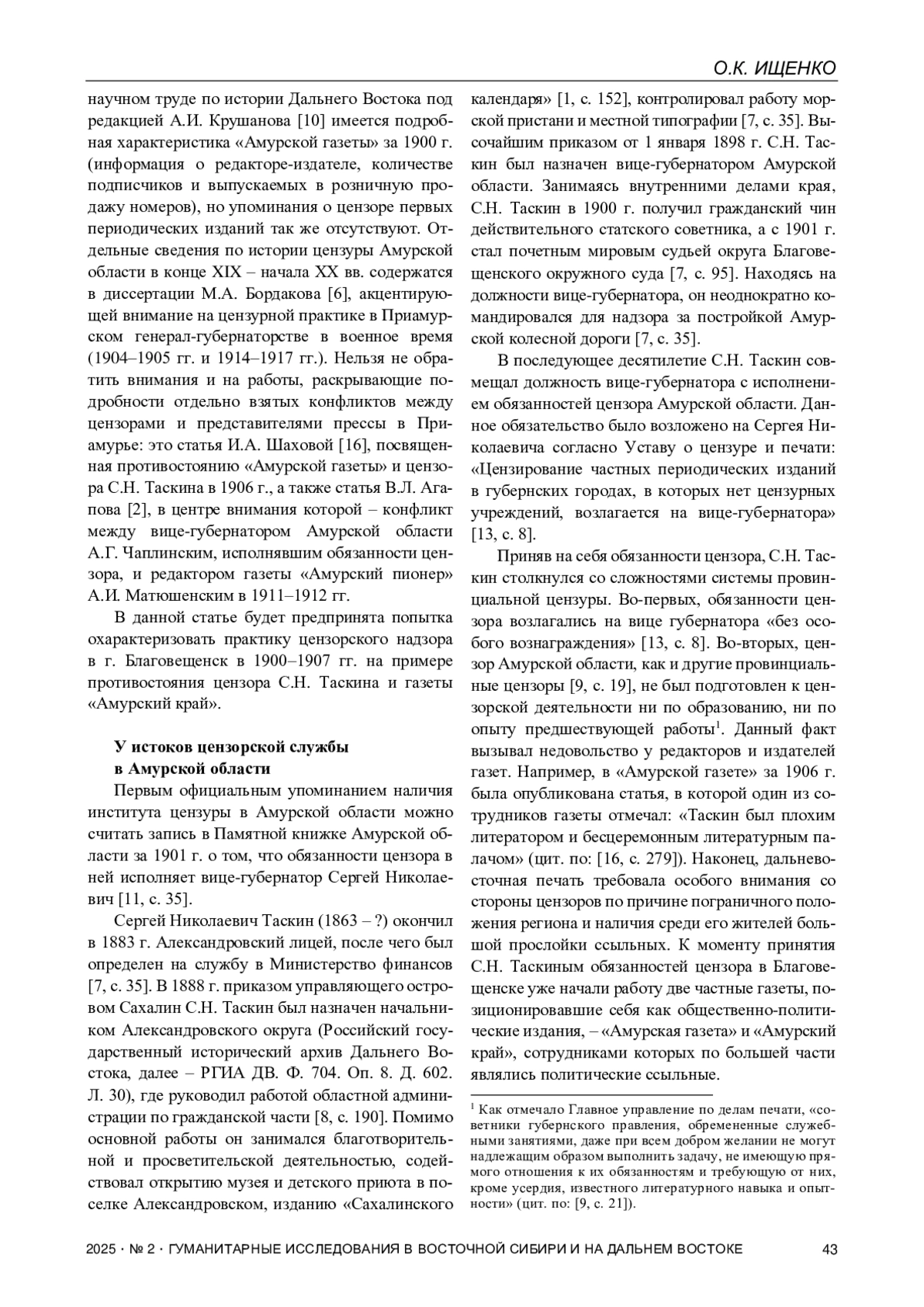 В настоящее время история цензуры в Амурской области в дореволюционный период продолжает оставаться малоизученной темой. К данному выводу позволяет прийти изучение научных трудов, посвященных периодической печати и цензорской службе в Амурской области в конце XIX – начале ХХ вв. В диссертации И. А. Шаховой [17] затрагиваются вопросы развития периодической печати в Амурской области в конце XIX в., раскрываются факты открытия первых частных газет в Благовещенске, но не приводятся данные о цензорах изданий «Амурская газета» (1895 г.) и «Амурский край» (1899 г.). В фундаментальном научном труде по истории Дальнего Востока под редакцией А. И. Крушанова [10] имеется подробная характеристика «Амурской газеты» за 1900 г. (информация о редакторе-издателе, количестве подписчиков и выпускаемых в розничную продажу номеров), но упоминания о цензоре первых периодических изданий так же отсутствуют. Отдельные сведения по истории цензуры Амурской области в конце XIX – начала ХХ вв. содержатся в диссертации М. А. Бордакова [6], акцентирующей внимание на цензурной практике в Приамурском генерал-губернаторстве в военное время (1904–1905 гг. и 1914–1917 гг.). Нельзя не обратить внимания и на работы, раскрывающие подробности отдельно взятых конфликтов между цензорами и представителями прессы в Приамурье: это статья И. А. Шаховой [16], посвященная противостоянию «Амурской газеты» и цензора С. Н. Таскина в 1906 г., а также статья В. Л. Агапова [2], в центре внимания которой – конфликт между вице-губернатором Амурской области А. Г. Чаплинским, исполнявшим обязанности цензора, и редактором газеты «Амурский пионер» А. И. Матюшенским в 1911–1912 гг.