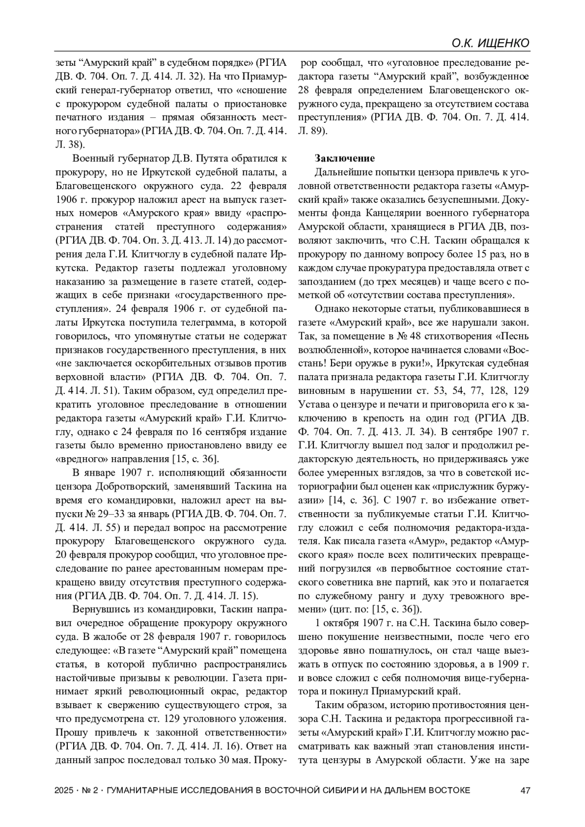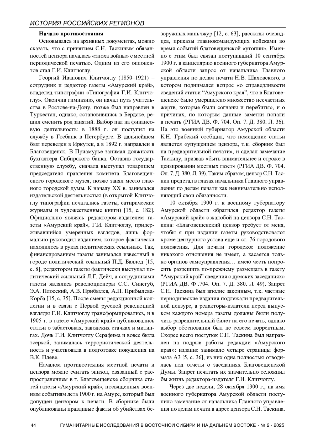 2. Агапов В.Л. “Возбуждение в населении неуважения и враждебного отношения к чинам правительства”: страница газетной войны против высших чиновников Приамурского края (1911-1912 гг.) // Новый исторический вестник. 2014. № 2. С. 150-162.