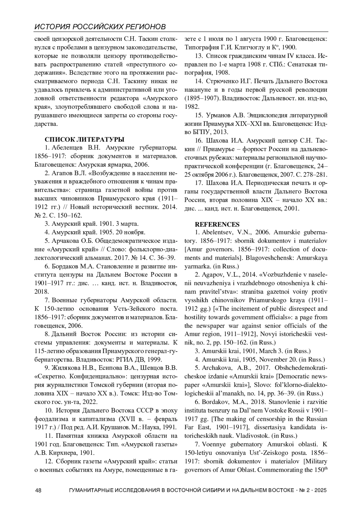 16. Шахова И.А. Амурский цензор С.Н. Таскин // Приамурье - форпост России на дальневосточных рубежах: материалы региональной научно-практической конференции (г. Благовещенск, 24-25 октября 2006 г.). Благовещенск, 2007. С. 278-281.