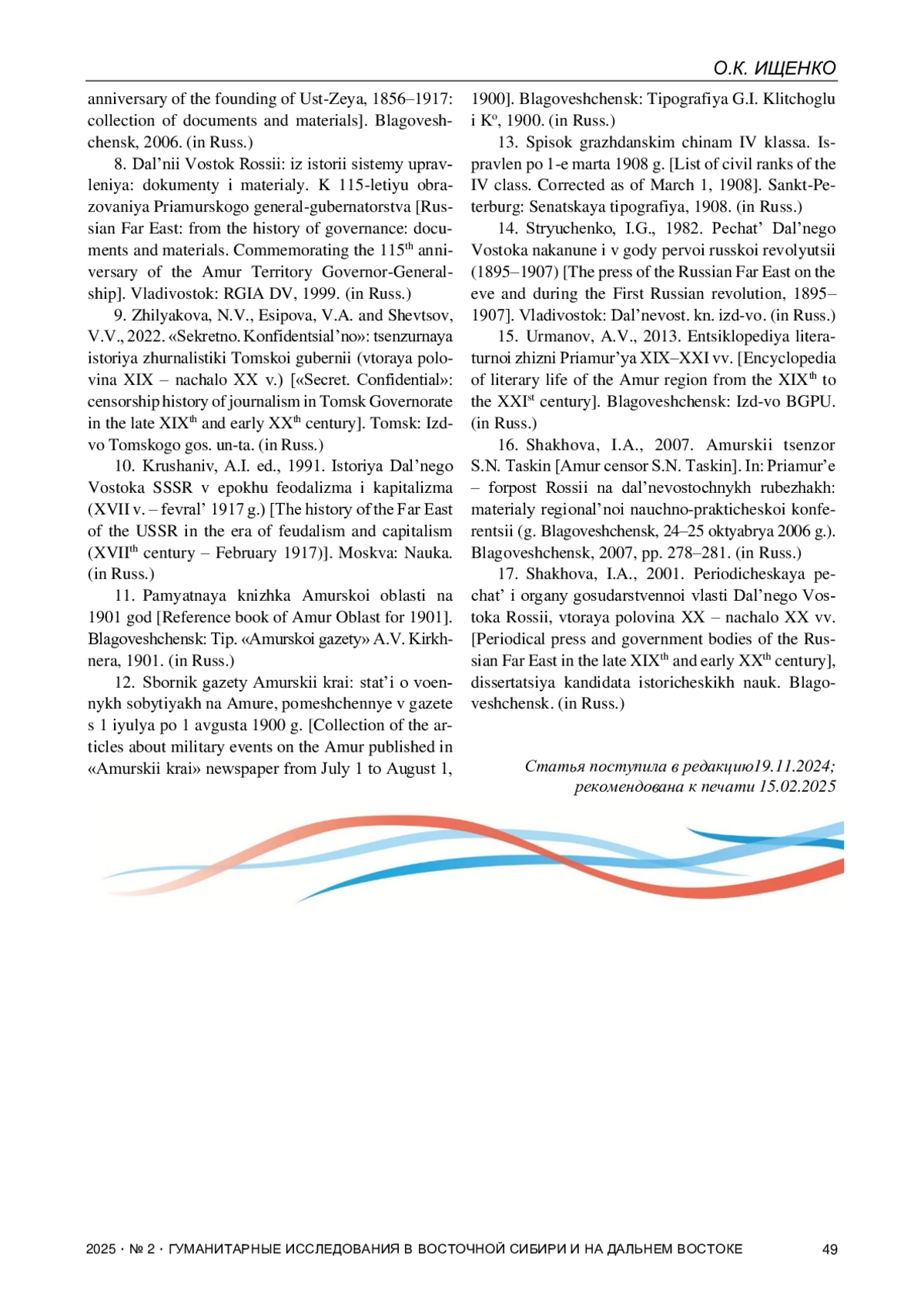 6. Бордаков М.А. Становление и развитие института цензуры на Дальнем Востоке России в 1901-1917 гг.: дис. … канд. ист. н. Владивосток, 2018.