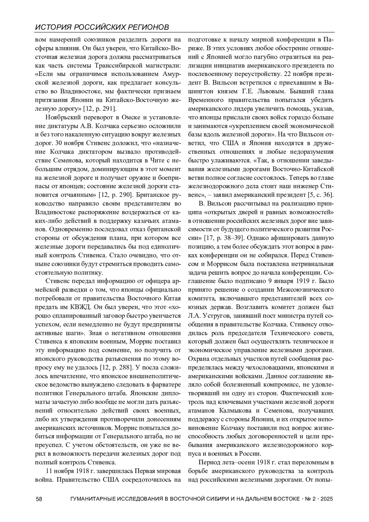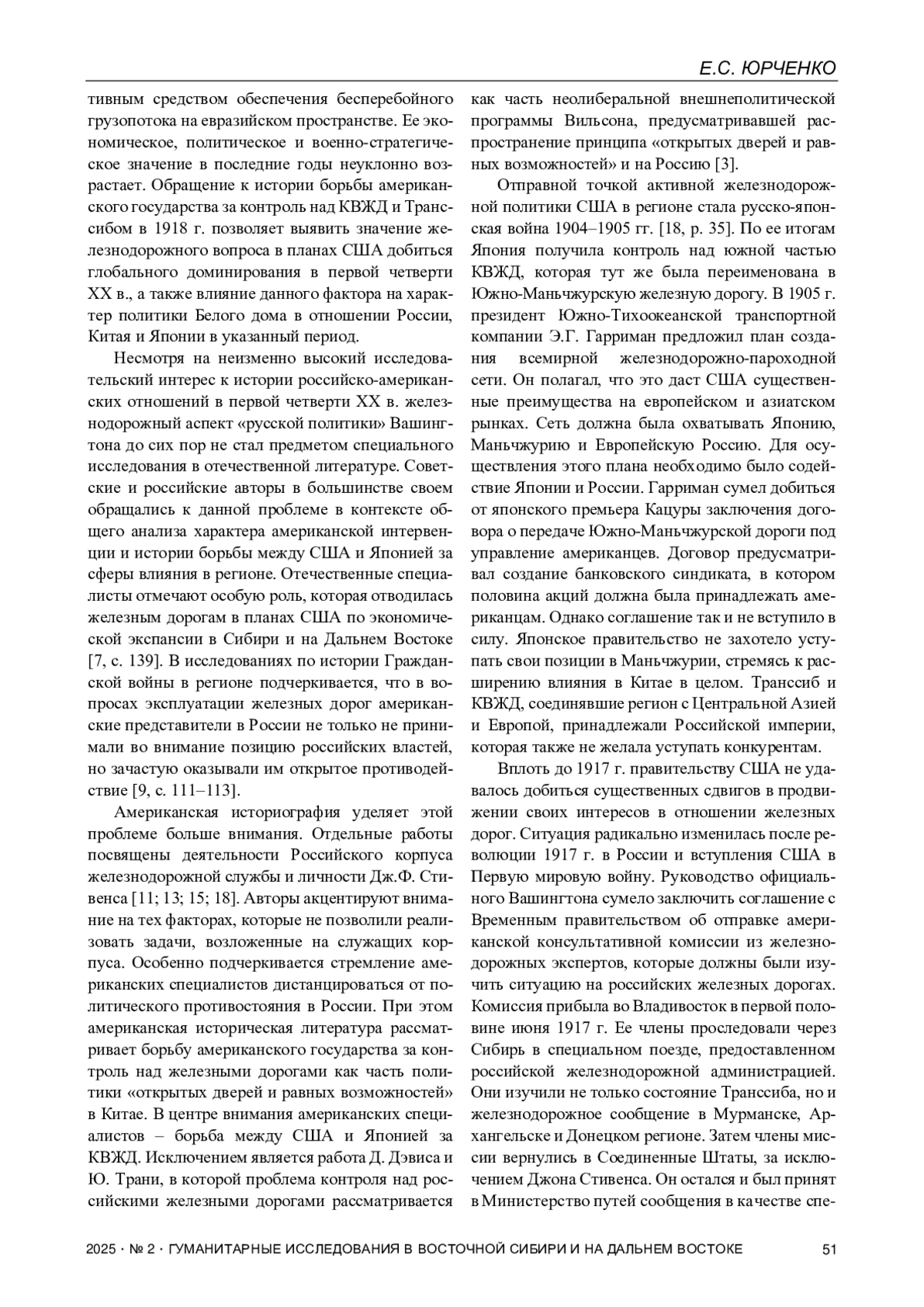 В современных геополитических реалиях позиции государств на мировой арене и их роль в экономической глобализации во многом определяются возможностью контролировать ключевые транспортные артерии. Российская железнодорожная система до сих пор является наиболее эффективным средством обеспечения бесперебойного грузопотока на евразийском пространстве. Ее экономическое, политическое и военно-стратегическое значение в последние годы неуклонно возрастает. Обращение к истории борьбы американского государства за контроль над КВЖД и Транссибом в 1918 г. позволяет выявить значение железнодорожного вопроса в планах США добиться глобального доминирования в первой четверти ХХ в., а также влияние данного фактора на характер политики Белого дома в отношении России, Китая и Японии в указанный период.