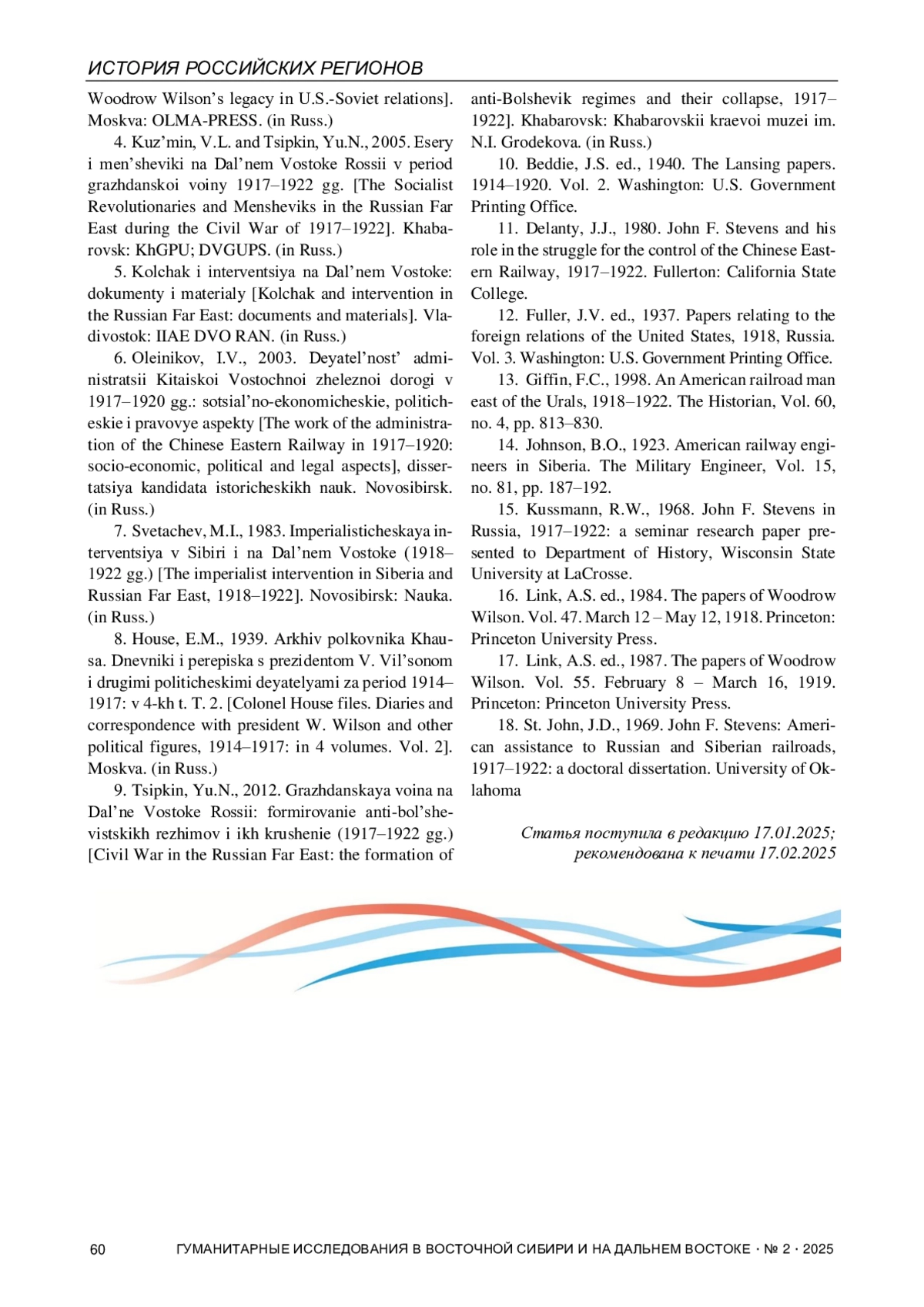 13. Giffin, F.C., 1998. An American railroad man east of the Urals, 1918-1922. The Historian, Vol. 60, no. 4, pp. 813-830.